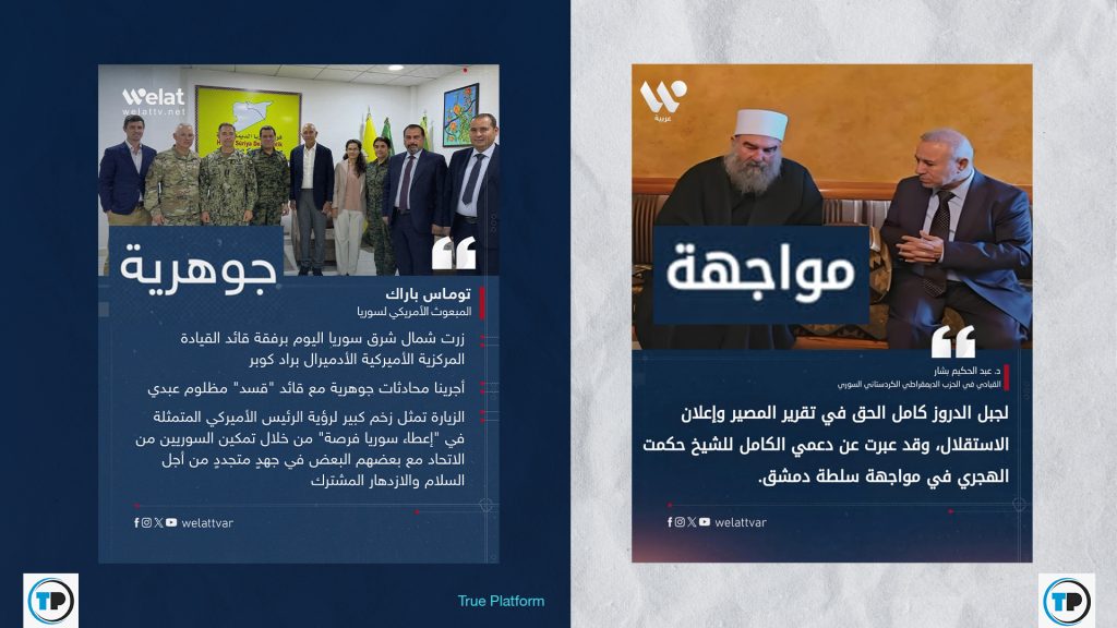 في ذات السياق تداول ناشرون التصريحات المزعومة مع صورة غرافيك تتشابه في تصميمها مع القالب المعتمد لدى قناة ولات ( Walat TV) الكردية، حيث ورد فيها “لجبل الدروز كامل الحق في تقرير المصير وإعلان الاستقلال، وقد عبرت عن دعمي الكامل للشيخ حكمت الهجري في مواجهة سلطة دمشق”.
