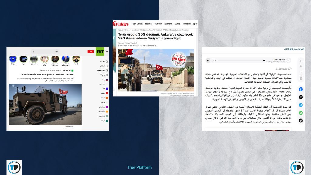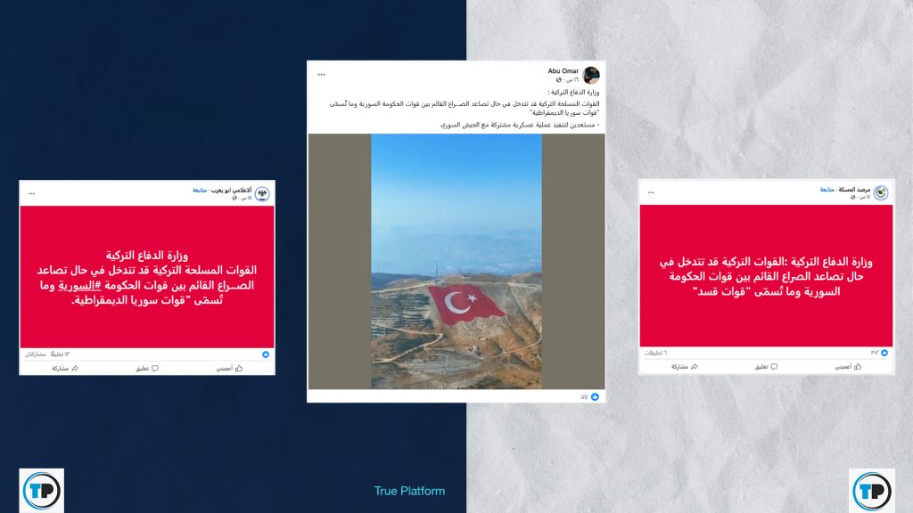 نسبت صفحات وحسابات في منصتي فيسبوك وإكس، مؤخراً، تصريحات إلى وزارة الدفاع التركية مفادها أن الجيش التركي قد “يتدخل في حال تصاعد الصراع القائم بين قوات الحكومة السورية و قوات سوريا الديمقراطية”.