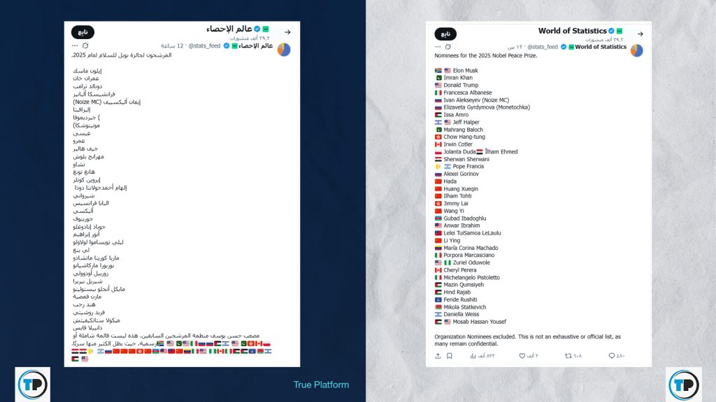 – هناك 338 مرشحاً لجائزة نوبل للسلام 2025، من بينهم 244 فرداً و94 منظمة، بينما يتضمن المنشور المتداول 32 اسماً فقط.