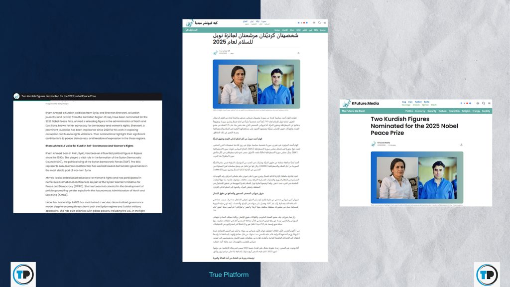 – أظهر البحث أن موقع Kfuture.Media الذي ينشط في إقليم كردستان العراق، نشر مطلع شباط/ فبراير الفائت، خبراً حول ترشيح إلهام أحمد وشيروان شيرواني لجائزة نوبل للسلام، دون تبيان الجهة التي رشحتهما ودون إيراد تفاصيل وافية حول ذلك.