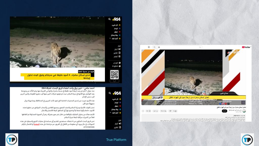 – أظهر البحث أن موقع +964 العراقي أورد في خبرٍ عن حادثة هروب أربعة أسود في سامراء أن “الصورة المتداولة تم التقاطها فعلاً من كاميرات مراقبة تابعة لسرايا السلام”، وسرايا السلام إحدى فصائل الحشد الشعبي العراقي.