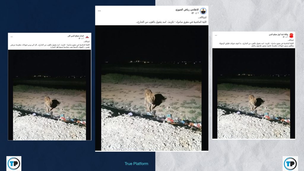 – أظهر البحث عبر غوغل أن وسائل إعلام عراقية نشرت الصورة المتداولة مع خبر يتحدث عن هروب أربعة أسود قبل أسبوع من محمية خاصة في سامراء غربي العراق، وأنها أثارت قلق السكان بعد رصدها في مناطق متفرقة من القضاء.