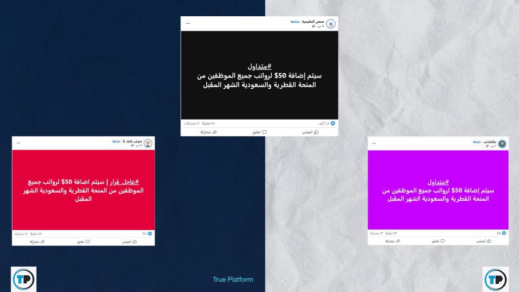 تداولت صفحات وحسابات على موقع فيسبوك، مؤخراً، خبراً عاجلاً يدّعي أن الحكومة السورية أصدرت قراراً بإضافة 50 دولاراً إلى رواتب جميع موظفيها، اعتباراً من الشهر المقبل، وذلك من المنحة السعودية القطرية.