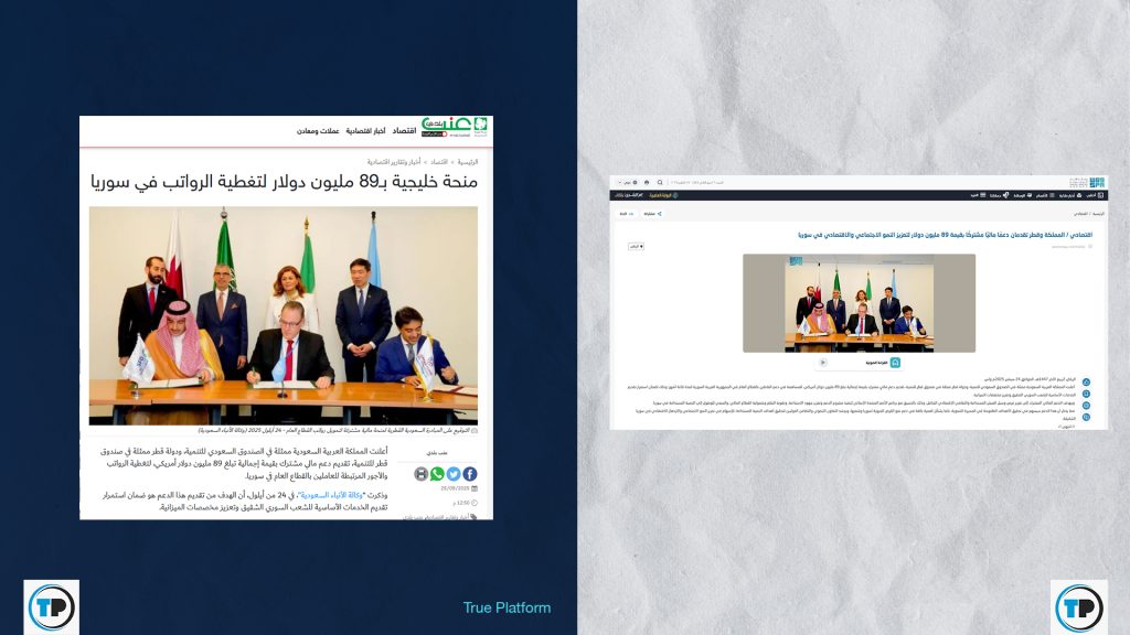 – أظهر البحث عبر غوغل أن المملكة العربية السعودية، ودولة قطر أعلنتا في 24 أيلول سبتمبر/ الماضي تقديم دعمٍ ماليٍ مشتركٍ بقيمة إجمالية تبلغ 89 مليون دولار أمريكي، للمساهمة في دعم العاملين بالقطاع العام في سوريا لمدة ثلاثة أشهر؛ وذلك “لضمان استمرار تقديم الخدمات الأساسية للشعب السوري الشقيق وتعزيز مخصصات الميزانية”.