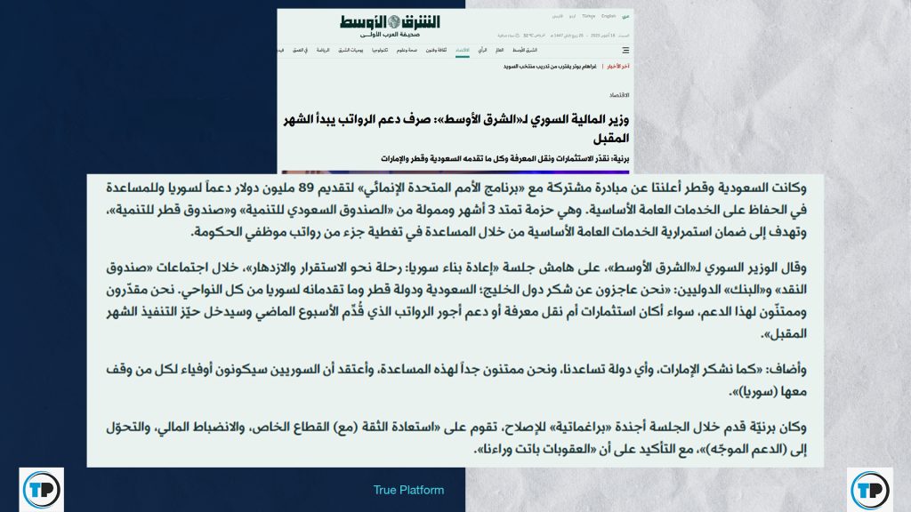 – أظهر البحث أن وزير المالية السوري صرَّح في 16 تشرين الأول/ أكتوبر الجاري أن “دعم أجور الرواتب الذي قدمته السعودية وقطر خلال الفترة الماضية سيبدأ صرفه الشهر المقبل”، لكنه لم يشر إلى وجود زيادة في رواتب الموظفين بمبلغ 50 دولار، بينما يتضِحُ من سياق الخبر أن الدعم السعودي والقطري هدفه “المساعدة في تغطية جزء من رواتب موظفي الحكومة”، وليس زيادتها.