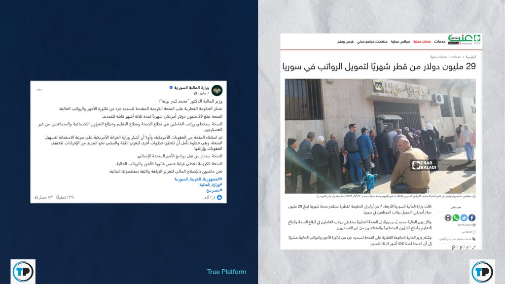 تحرى فريق شبكة تدقيق المعلومات – True Platform، حقيقة الخبر، فراجع موقعي وزارتي المالية السورية والشؤون الاجتماعية والعمل وحساباتهما، إضافة إلى وسائل إعلام رسمية ومستقلة، كما أجرى بحثاً باستخدام كلمات مفتاحية عبر غوغل، وتبين أن الادعاء مضلل.
