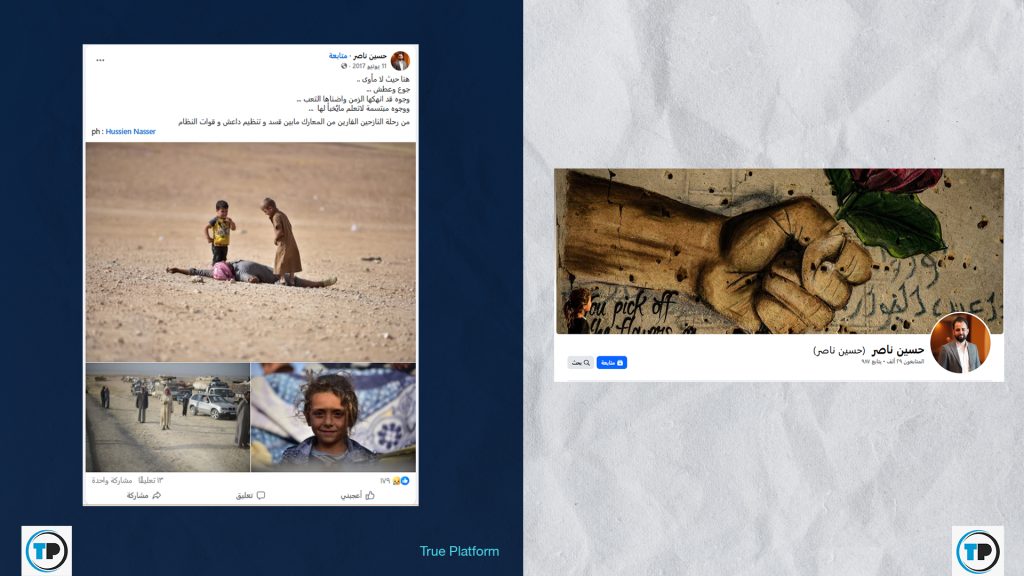 – أظهر البحث أن الصحفي حسين ناصر نشر الصورة المتداولة مع صورتين أخريين على حسابه في فيسبوك في 11 حزيران / يونيو 2017، وتعليق قال فيه:” هنا حيث لا مأوى .. جوع وعطش …وجوه قد انهكها الزمن واضناها التعب …ووجوه مبتسمة لا تعلم ما يُخبأ لها … من رحلة النازحين الفارين من المعارك ما بين قسد و تنظيم داعش و قوات النظام”، دون الإشارة إلى أن النازح قد مات أو أغمي عليه خلال رحلة نزوحه.
