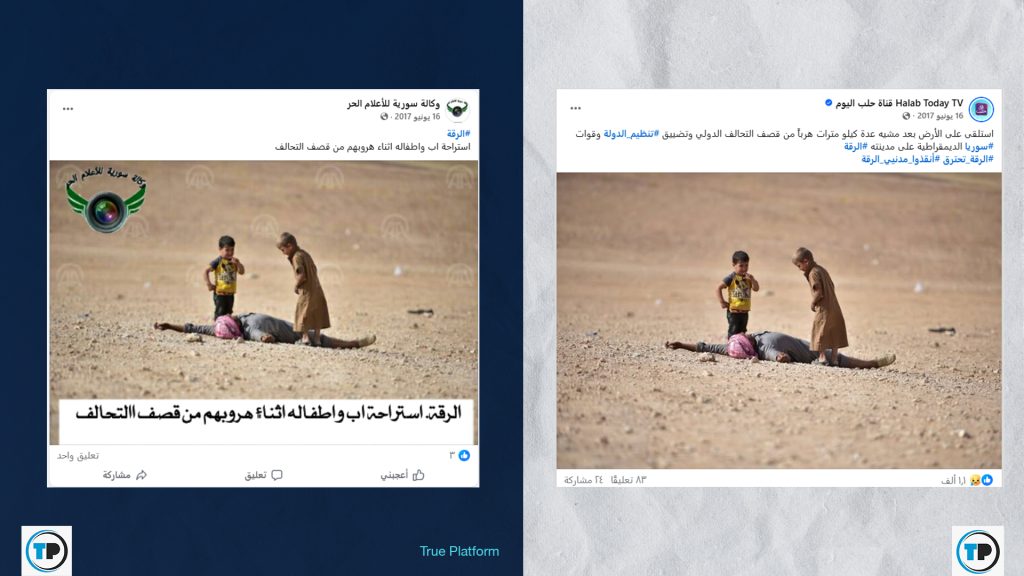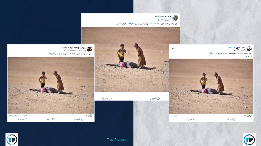 تداولت صفحات وحسابات على منصتي فيسبوك وإكس، مؤخراً، هذه الصورة مع ادعاء أنها لنازح من الرقة سقط ميتاً تاركاً طفليه في منتصف رحلة النزوح من مدينة الرقة، خلال المعارك التي دارت بين قوات سوريا الديمقراطية المدعومة من التحالف الدولي وبين تنظيم داعش، عام 2017.