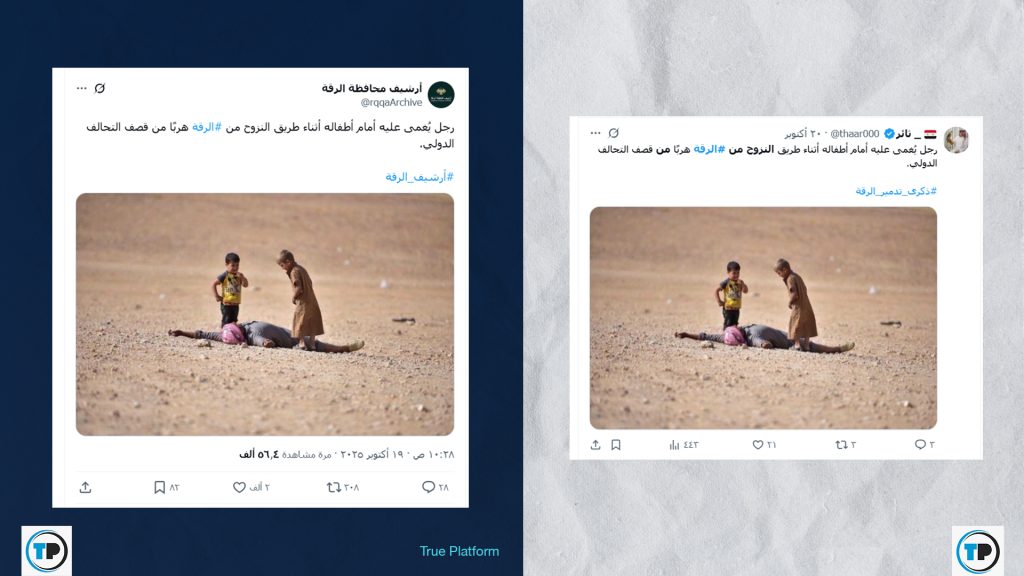 – نشرت صفحات وحسابات محلية على منصتي فيسوك وإكس الصورة السابقة بالتزامن مع حلول الذكرى السنوية الثامنة لسيطرة قوات سوريا الديمقراطية على مدينة الرقة بدعم من التحالف الدولي وإخراج تنظيم داعش، مع تعليق يقول:”رجل يُغمى عليه أمام أطفاله أثناء طريق النزوح من #الرقة هرباً من قصف التحالف الدولي“.