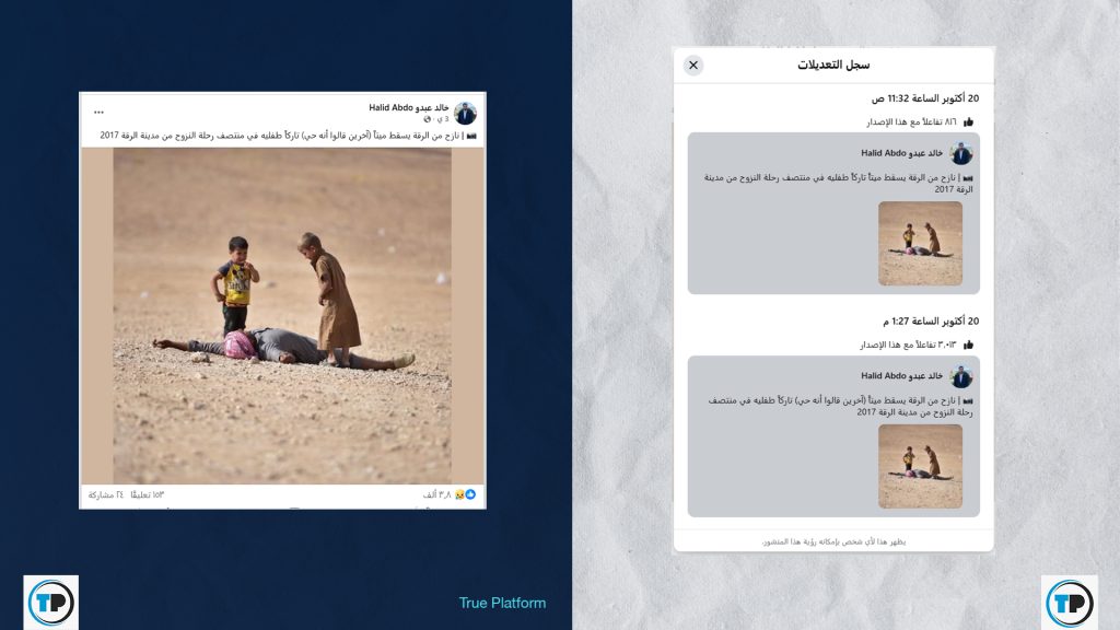 – أظهر البحث عبر فيسبوك أن ذات الصورة نشرتها صفحات ووسائل إعلام سوريا عام 2017، مع توصيف يقول: “استلقى على الأرض بعد مشيه عدة كيلو مترات هرباً من قصف التحالف الدولي وتضييق تنظيم الدولة وقوات سوريا الديمقراطية على مدينته الرقة”.
