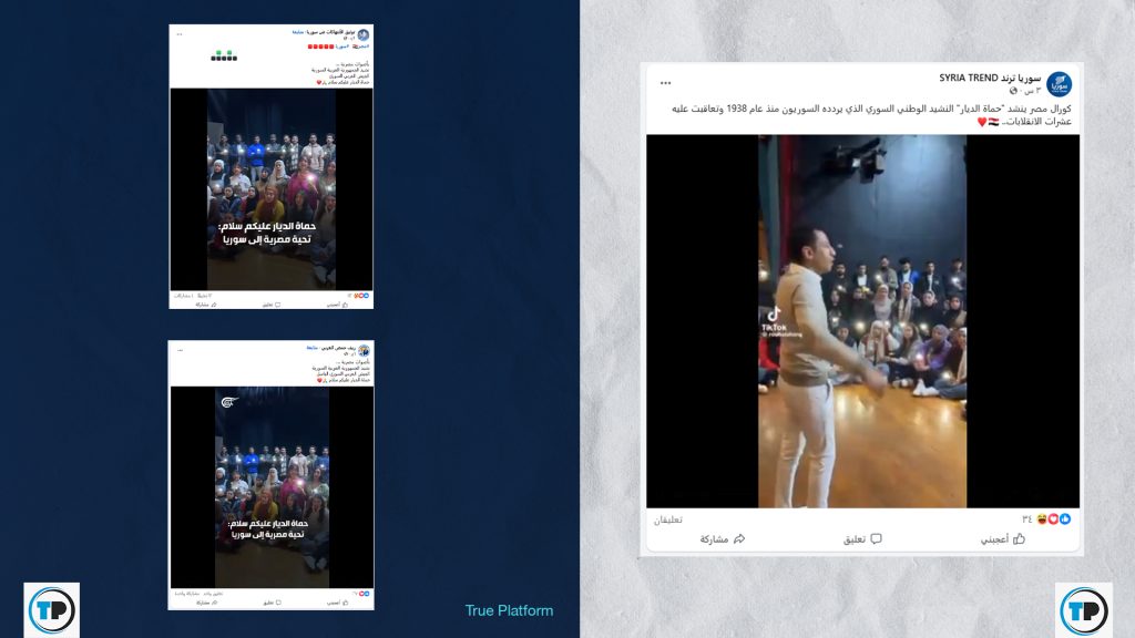 تداولت حسابات وصفحات على منصة فيسبوك، في الساعات الأخيرة، هذا الفيديو مع ادعاء أنه لكورال مصر وهو ينشد “حماة الديار”، النشيد الوطني السوري منذ العام 1938.