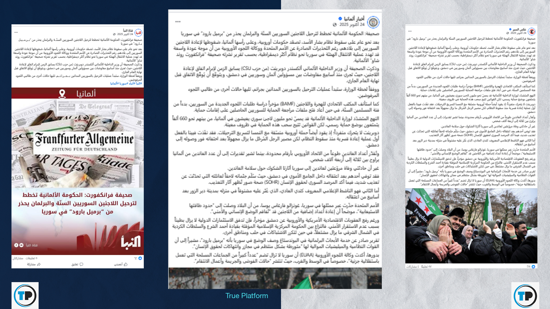 تحرّى فريق شبكة تدقيق المعلومات – True Platform،صحة الادعاء، فراجع النسخة الأصلية للمقال المنشور في صحيفة فرانكفورت روندشاو الألمانية، وتصريحات وزارة الداخلية الألمانية، ومكتب الهجرة واللاجئين (BAMF)، وبحث في وسائل إعلام، وتبين أن الادعاء مضلل.