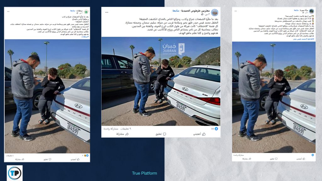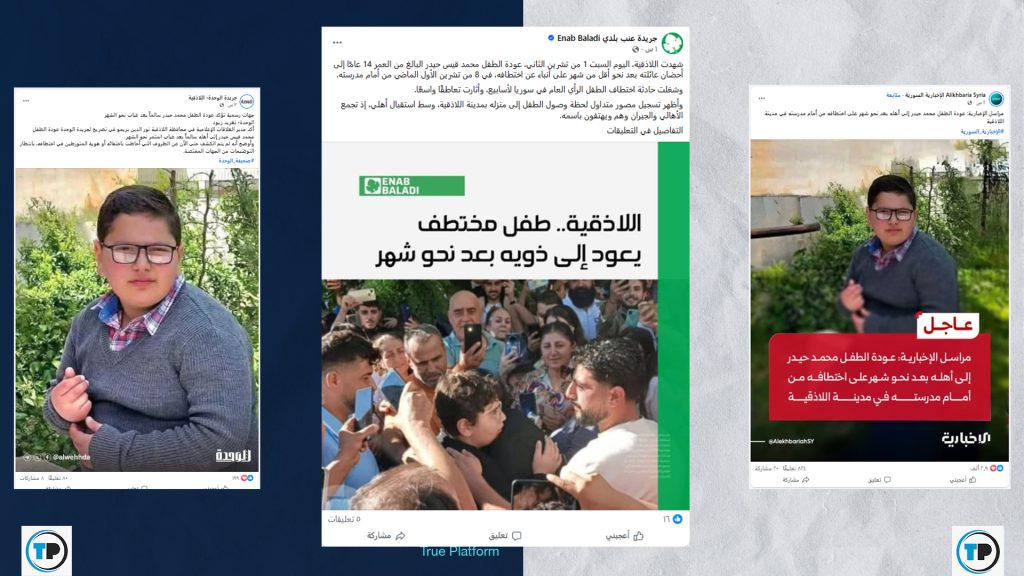 تداول نشطاء إلى جانب صفحات وحسابات عبر منصتي فيسبوك وإكس، خلال الساعات الأخيرة، منشوراتٍ تزعم أن قصة اختطاف الطفل محمد قيس حيدر، الذي عاد مساء اليوم إلى منزله في اللاذقية، “ما هي إلا فبركة من جانب فلول النظام السابق لزرع الخوف والفتنة بين المدنيين”.