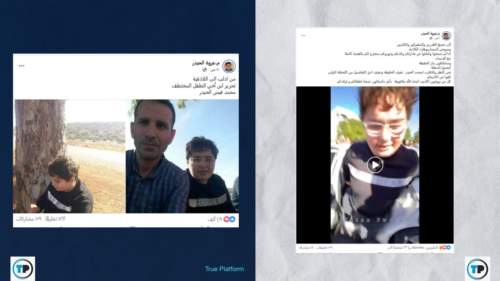 -نشر عم الطفل محمد حيدر على حسابه في فيسبوك، أكثر من منشور أكد في إحداها عودة ابن أخيه من إدلب إلى اللاذقية، من دون ذكر تفاصيل إضافية، فيما استنكر في منشور آخر التشكيك في صحة حادثة اختطافه.