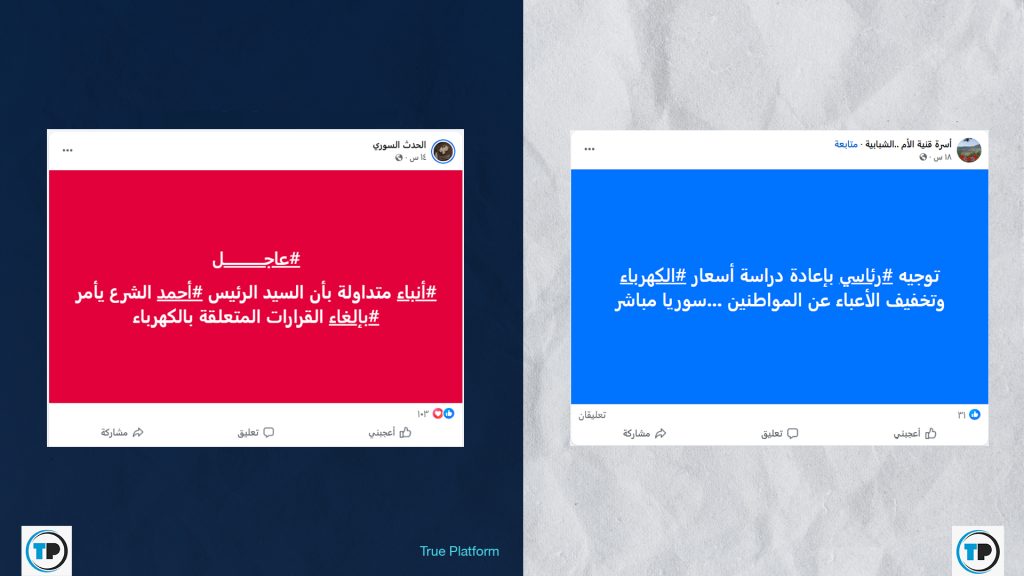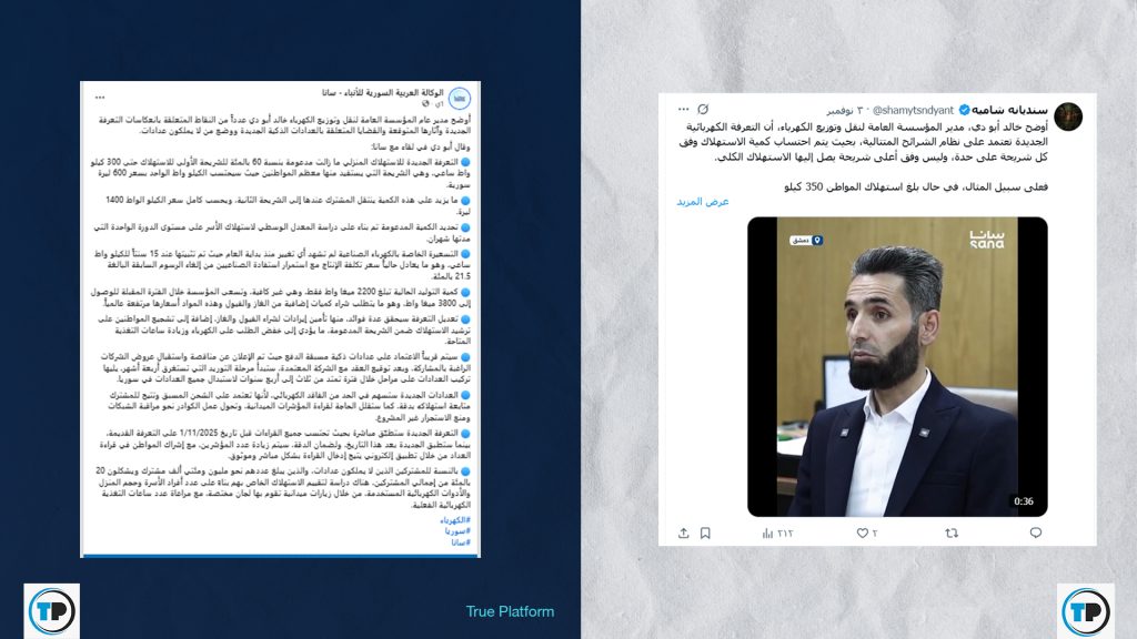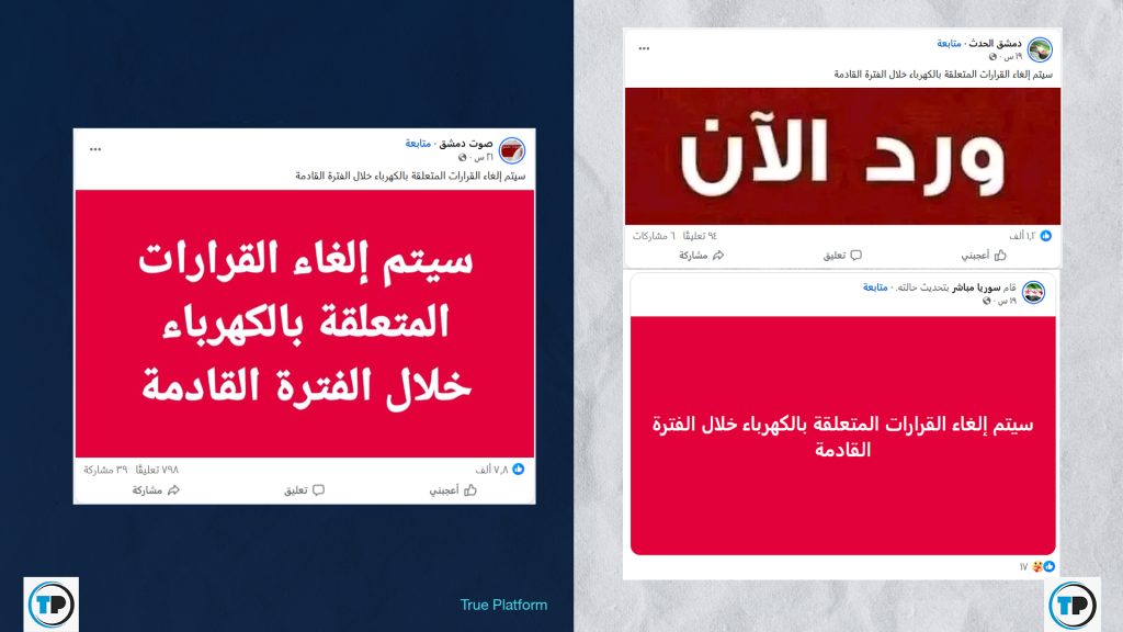وفي ذات السياق، تداولت حسابات أخرى ادعاءً مفاده صدور توجيه من الرئاسة السورية لإعادة دراسة أسعار الكهرباء بهدف تخفيف الأعباء عن المواطنين، بينما زعمت صفحات أن الرئيس السوري أمر بإلغاء القرارات المتعلقة برفع سعر الكهرباء.