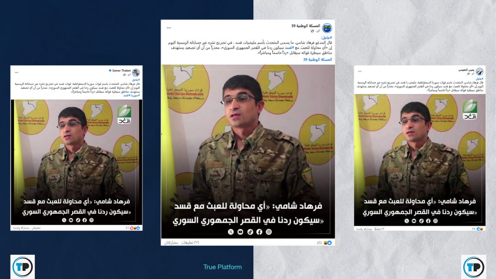 تحرّى فريق شبكة تدقيق المعلومات – True Platform، حقيقة التصريحات، وأجرى بحثاً عبر المصادر المفتوحة، شمل حسابات شامي وحسابات قوات سوريا الديمقراطية، إضافة إلى وسائل إعلام سورية رسمية ومستقلة، وتبيّن أنها مفبركة.