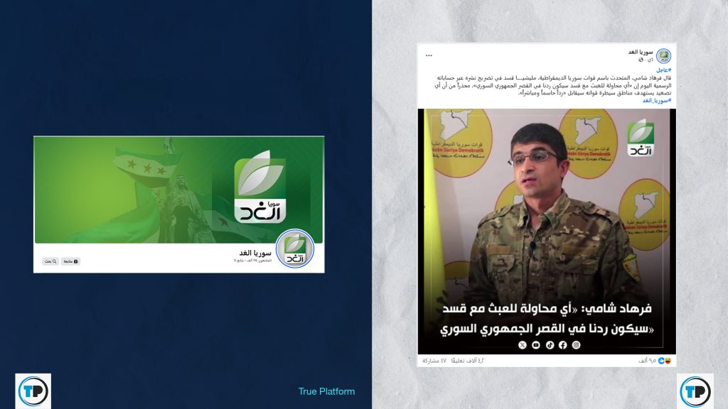 – تبين أن مصدر هذه التصريحات هي صفحة باسم “سوريا الغد”، اعتادت أخبار و تصريحات مضللة و مفبركة حول الشأن السوري.