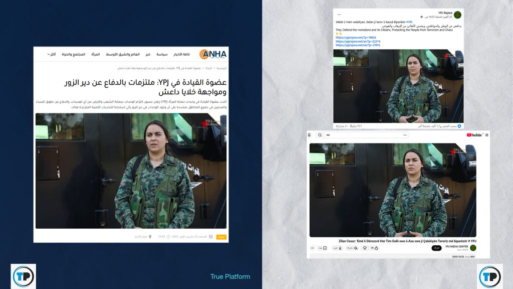 -أظهر البحث العكسي أن الصورة المرفقة مع الادعاء مأخوذة من فيديو نشرته وحدات حماية المرأة في 22 تشرين الأول/أكتوبر 2024، وتظهر فيه القيادية جيلان جسور وهي تتحدث عن وجود وحدات حماية المرأة في دير الزور.