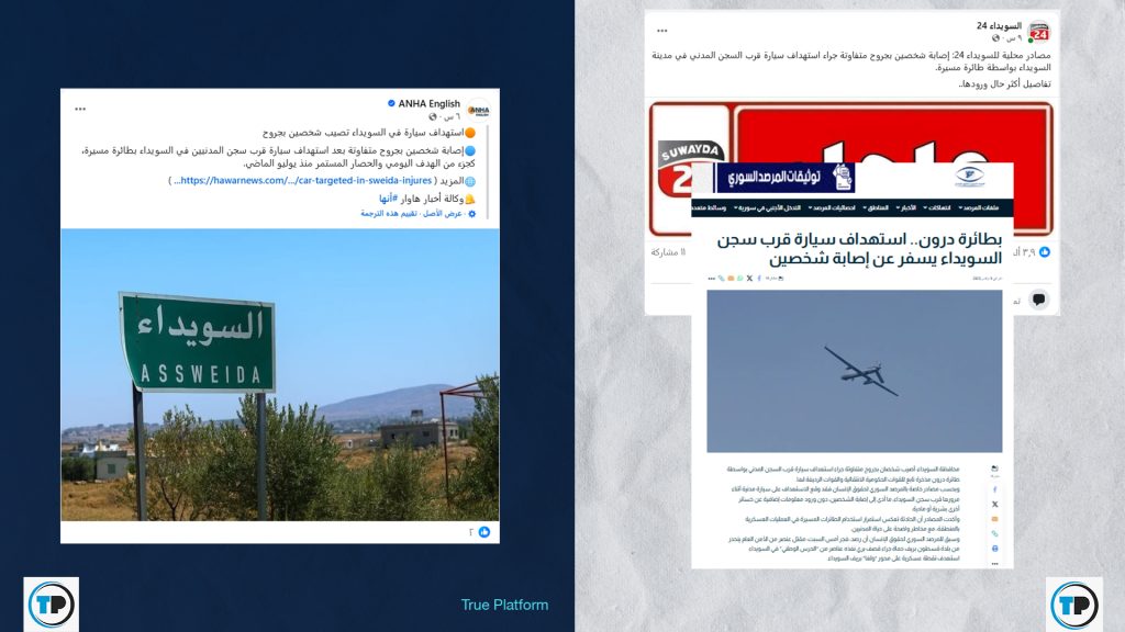 -أظهر البحث أن نشطاء ومواقع محلية، إضافة إلى وسائل إعلام سورية، نقلت خبراً مفاده إصابة شخصين بجروح متفاوتة، جراء استهداف طائرة مسيرة لسيارة قرب السجن المدني في السويداء، “وفي حين قال المرصد السوري لحقوق الإنسان إنها طائرة مُسيّرة مُذخّرة تتبع للقوات الحكومية الانتقالية والقوات الرديفة لها”، لم تنشر وسائل إعلام محلية أو سورية، تفاصيل شاملة وواضحة عن الحادثة، مستندة إلى مصادر صريحة وموثوقة، رغم مرور أكثر من 9 ساعات على الحادثة.