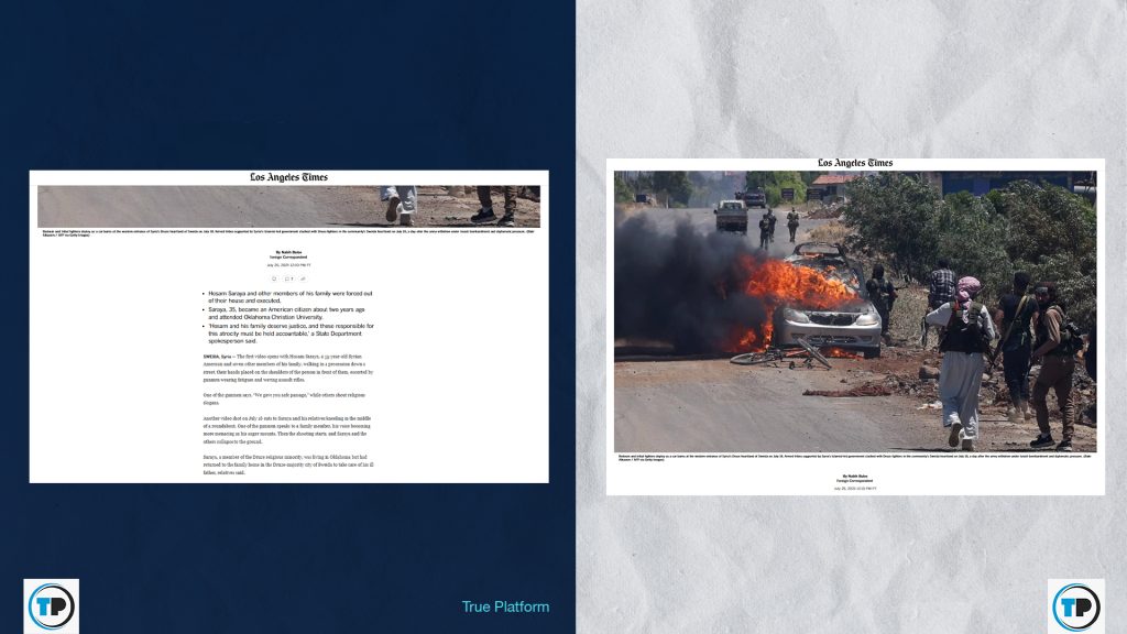 تحرى فريق شبكة تدقيق المعلومات – True Platform، حقيقة الصورة والادعاء، وأجرى بحثاً عكسياً عن الصورة، وبحثاً عبر المصادر المفتوحة شمل وسائل إعلام سورية مستقلة ورسمية إضافة إلى حسابات تابعة لفصائل محلية في السويداء، وتبين أن الصورة لا علاقة لها بالادعاء.