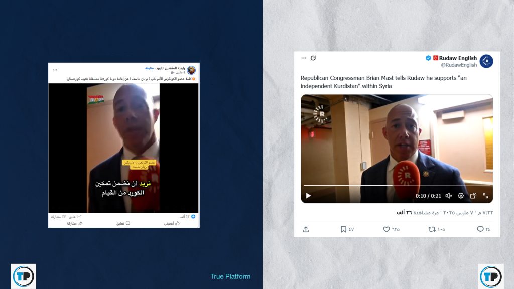 تداولت صفحات وحسابات على منصة فيسبوك، مؤخراً، مقطع فيديو يُظهِر رئيس لجنة العلاقات الخارجية في مجلس النواب الأمريكي وعضو الكونغرس، برايان ماست، وهو يتحدث لقناة رووداو الكردية عن دعمه لإقامة دولة كردية في سوريا.