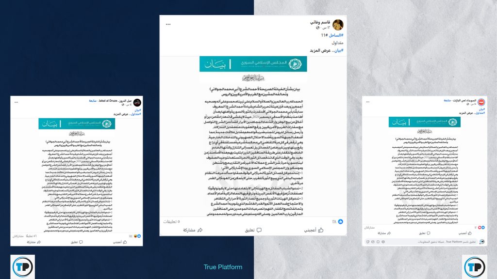 – الادعاء بأن المجلس الإسلامي السوري أصدر بياناً يتهم فيه الرئيس أحمد الشرع بالخيانة بعد التحالف مع الغرب، ادعاء مفبرك.