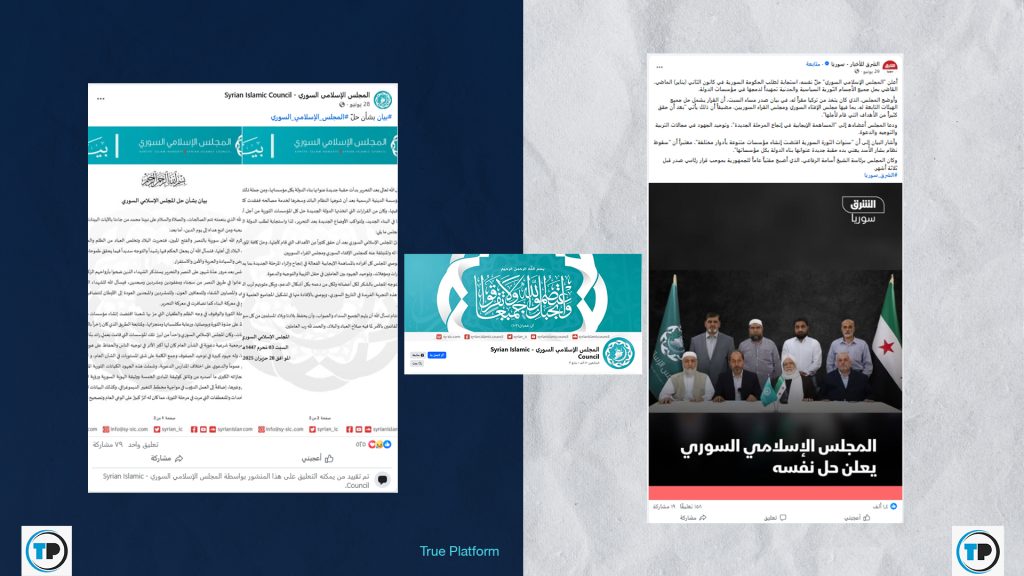 تحرى فريق شبكة تدقيق المعلومات – True Platform حقيقة البيان، وراجع الحسابات الرسمية للمجلس الإسلامي السوري، إلى جانب البحث عبر المصادر المفتوحة ووسائل الإعلام، وتبيّن أن كلا البيانين مفبرك.