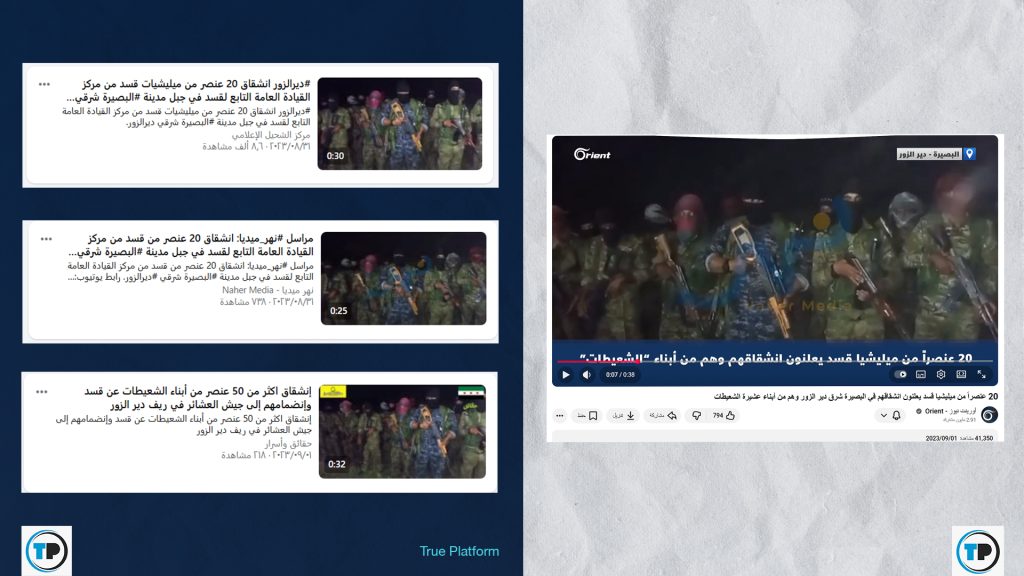 – أظهر البحث العكسي أن وسائل إعلام سورية وحسابات في منصات التواصل، نشرت الفيديو في الأول من أيلول/سبتمبر 2023، على أنه يوثّق انشقاق 20 عنصراً فقط من أبناء قبيلة الشعيطات عن قوات سوريا الديمقراطية.