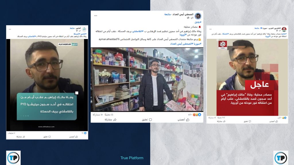 – الادعاء أن الشاب مالك أحمد إبراهيم قُتل تحت التعذيب في سجن لقوات سوريا الديمقراطية في القامشلي، غير صحيح.