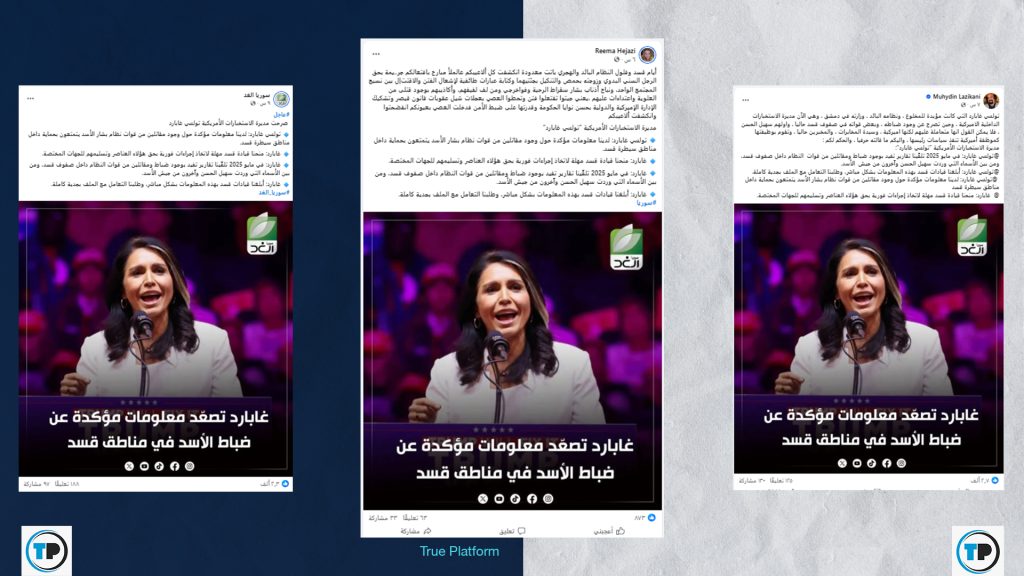 – التصريحات المتداولة والمنسوبة لمديرة الاستخبارات الأمريكية تولسي غابارد، والتي تزعم أنها تحدثت عن تواجد مقاتلين من قوات نظام بشار الأسد يتمتعون بحماية داخل مناطق سيطرة قسد وضرورة تسليمهم للحكومة السورية، مفبركة.