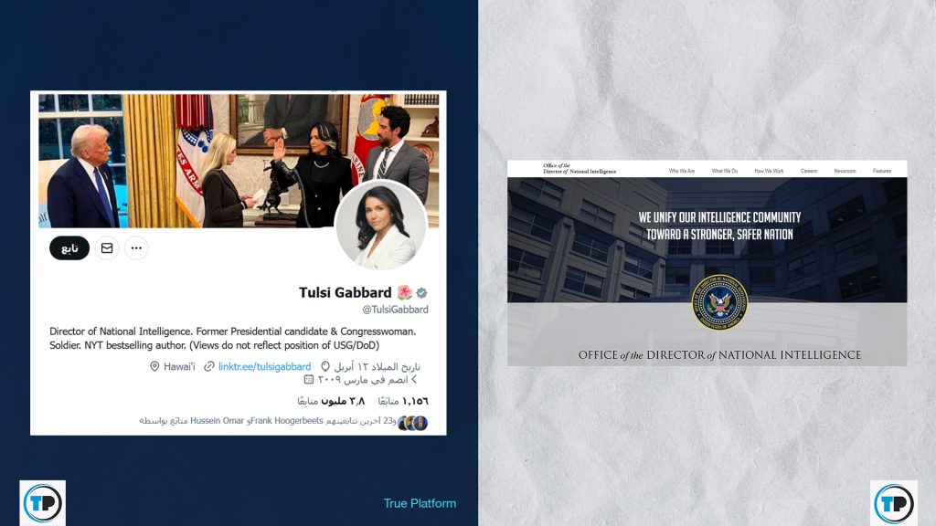 – لم يُعثر في الموقع الرسمي لمكتب مدير الاستخبارات الوطنية، ولا في حسابات غابارد، على أي تصريح مماثل.