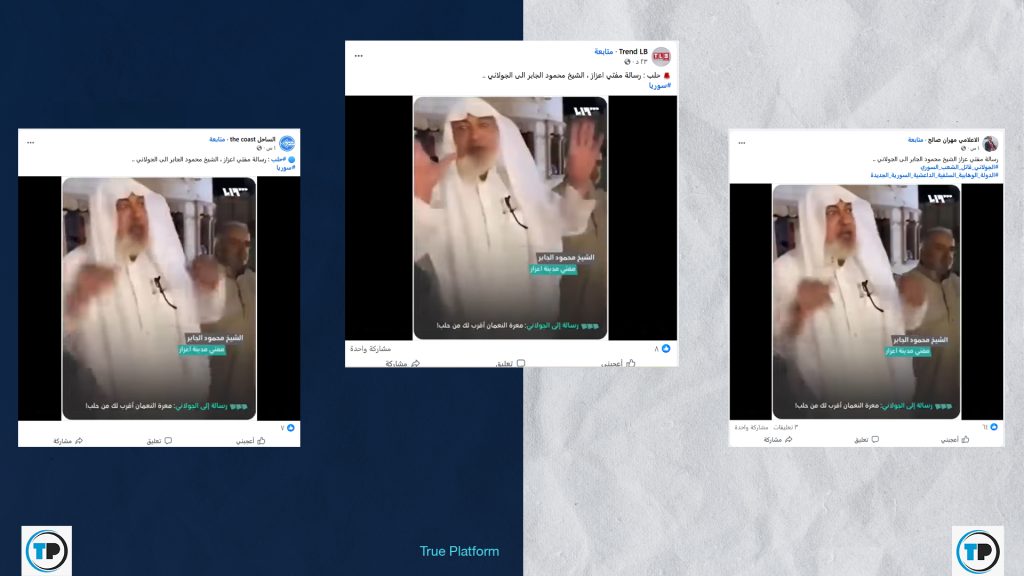 تداولت حسابات وصفحات على منصات التواصل الاجتماعي، مؤخراً، مقطع فيديو مع ادعاء أنه يظهر مفتي مدينة إعزاز، الشيخ محمود الجابر، وهو يوجه رسالة إلى الرئيس السوري، أحمد الشرع، يهاجمه فيها ويصفه بـ”الجولاني”.