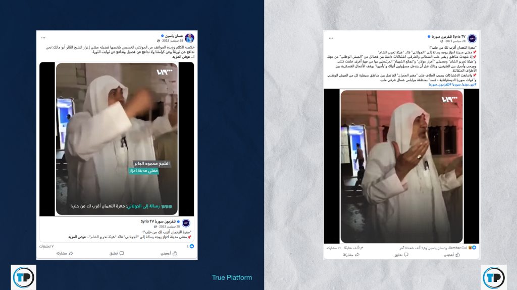 -أظهر البحث عبر فيسبوك أن “قناة تلفزيون سوريا” كانت قد نشرت المقطع الأصلي بتاريخ 28 أيلول/سبتمبر 2023، مرفقاً بتعليق: “معرة النعمان أقرب لك من حلب.. مفتي مدينة إعزاز يوجه رسالة إلى الجولاني قائد هيئة مضللتحرير الشام”.