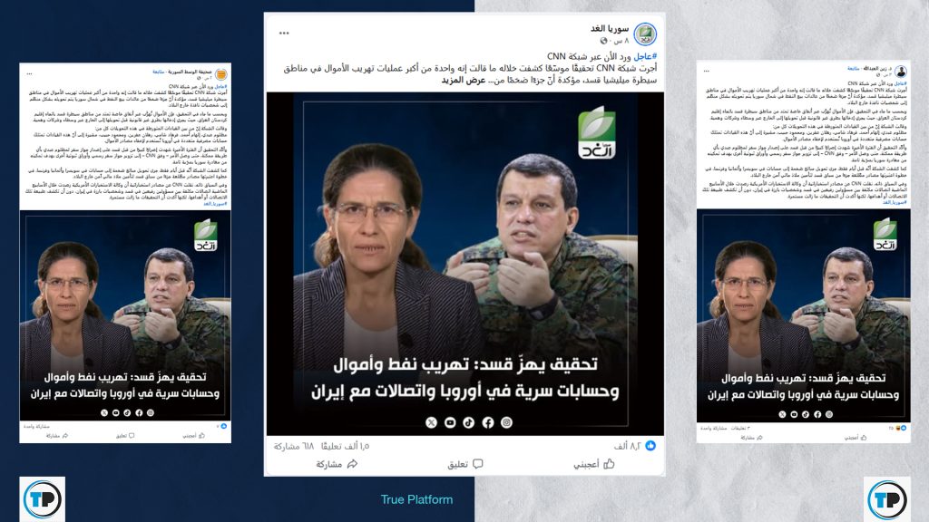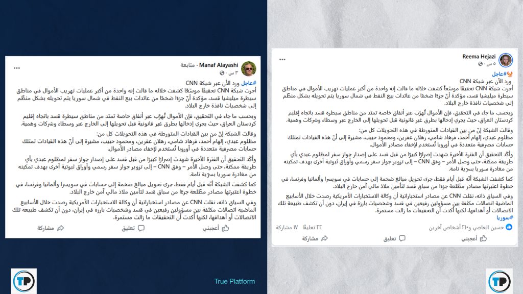 تداولت صفحات وحسابات على منصة فيسبوك، مؤخراً، ادعاءً بأن شبكة CNN كشفت، في تحقيق موسّع، ما قالت إنه “واحدة من أكبر عمليات تهريب الأموال” في مناطق سيطرة قوات سوريا الديمقراطية (قسد).