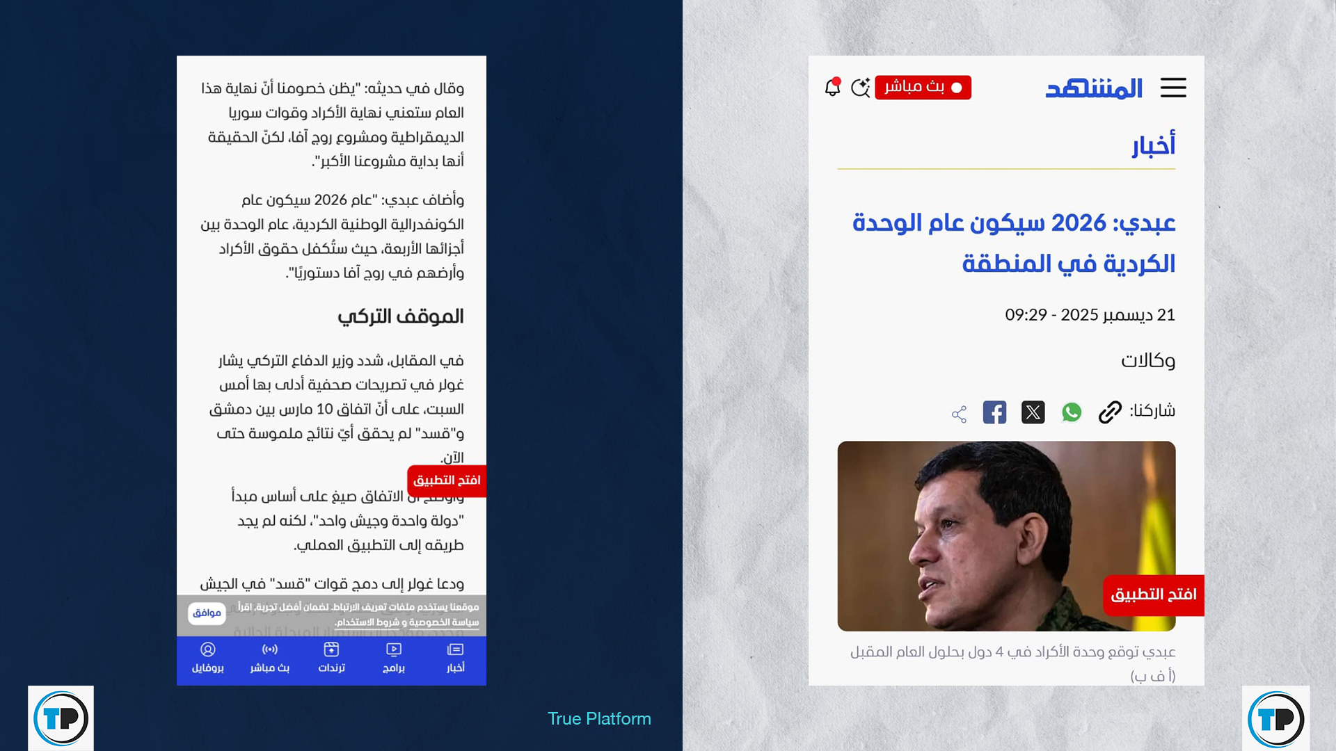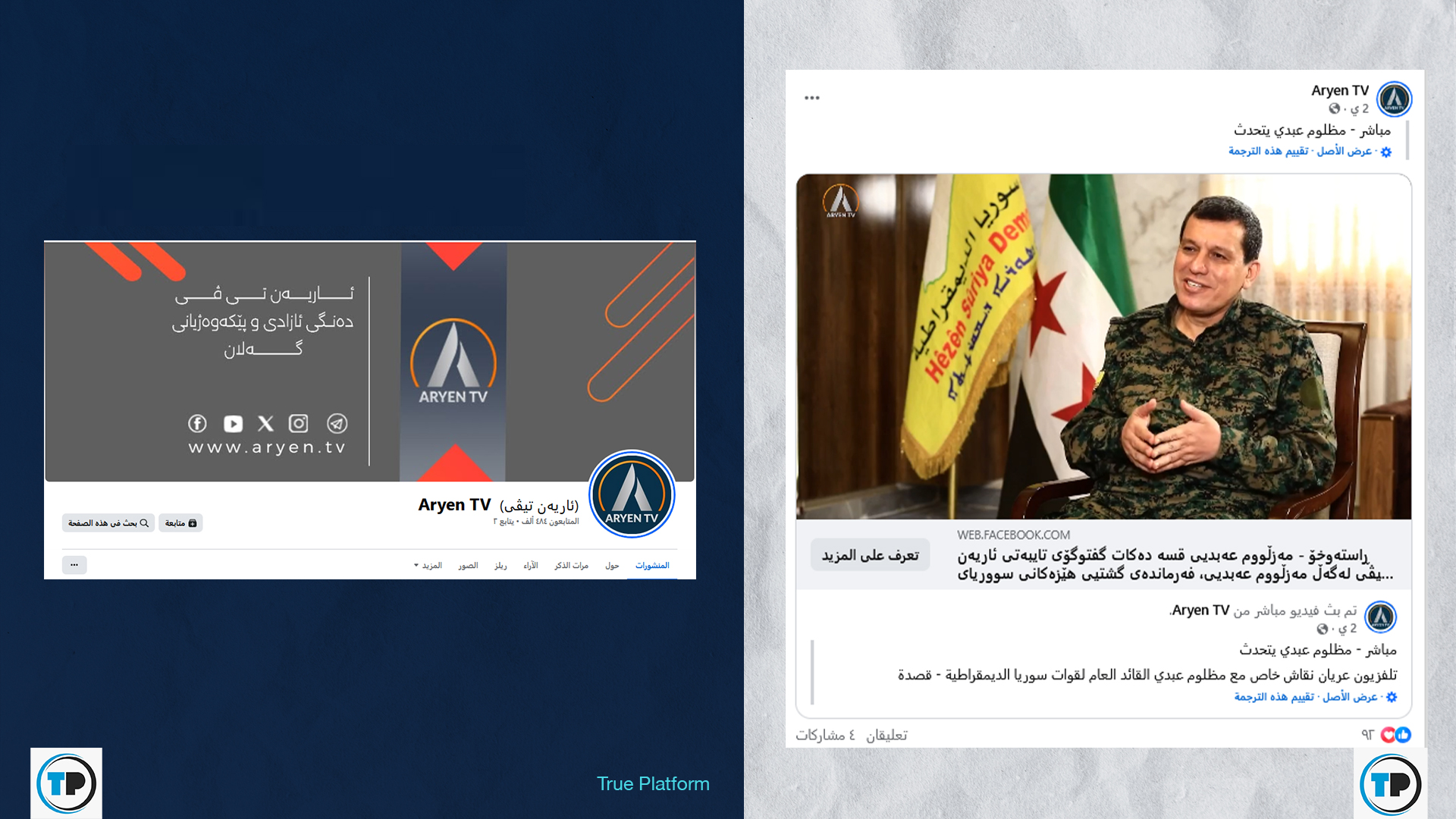 تحرى فريق “شبكة تدقيق المعلومات – True Platform” حقيقة التصريحات، وذلك عبر مراجعة المقابلة الأصلية لمظلوم عبدي مع فضائية “Aryen TV” الكردية (تاريخ 19 كانون الأول 2025) ومقارنة النص الكردي بالترجمة العربية المتداولة؛ وتبيّن أن الادعاء مضلل.