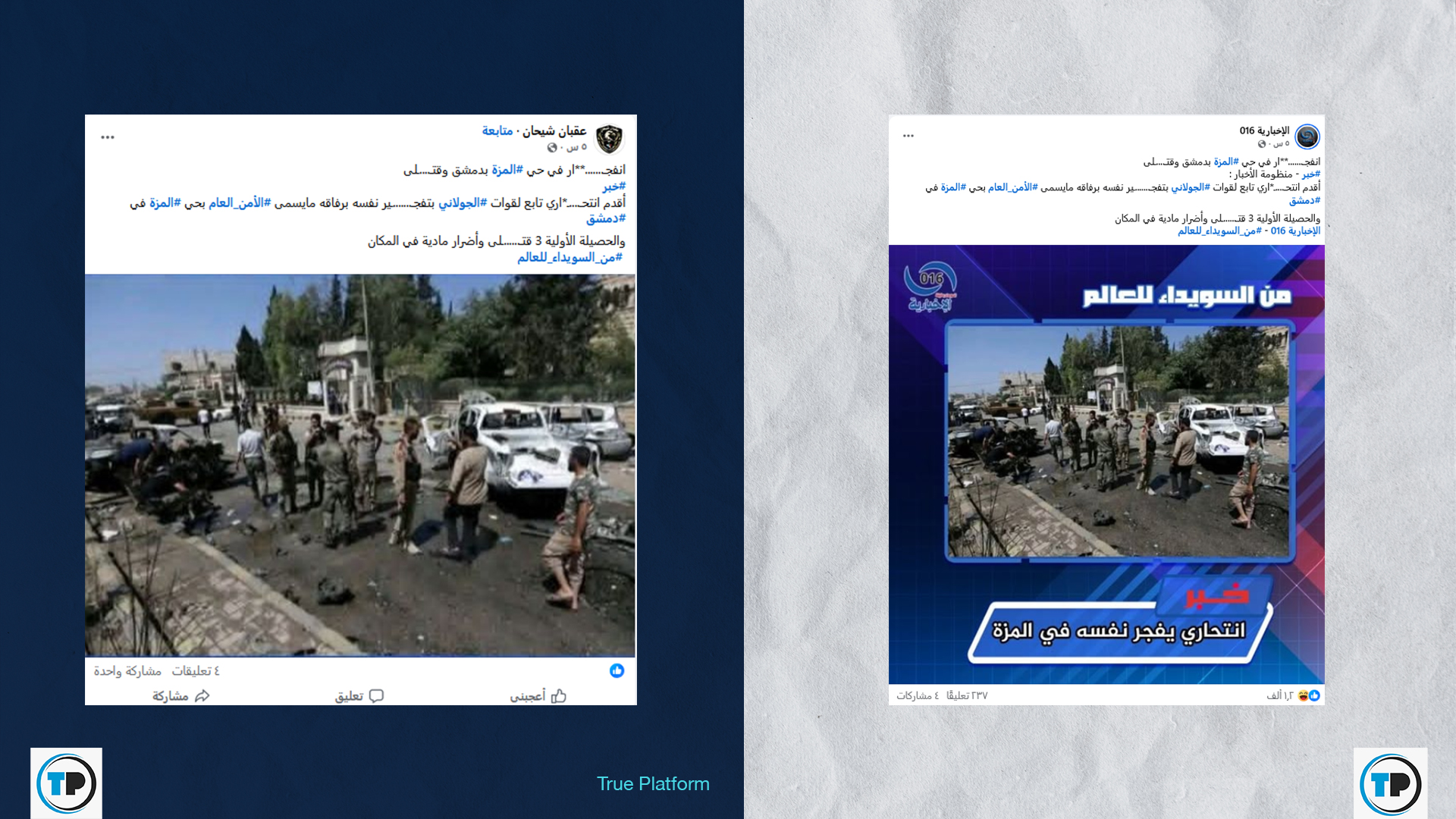 تداولت حسابات وصفحات عبر منصة فيسبوك ادعاءً مفاده أن انتحارياً أقدم على تفجير نفسه بمجموعة من رفاقه في جهاز “الأمن العام” (الأمن الداخلي) بحي المزة في دمشق، مما أسفر عن مقتل 3 عناصر ووقوع أضرار مادية، وذلك عقب سماع دوي انفجار في المنطقة.