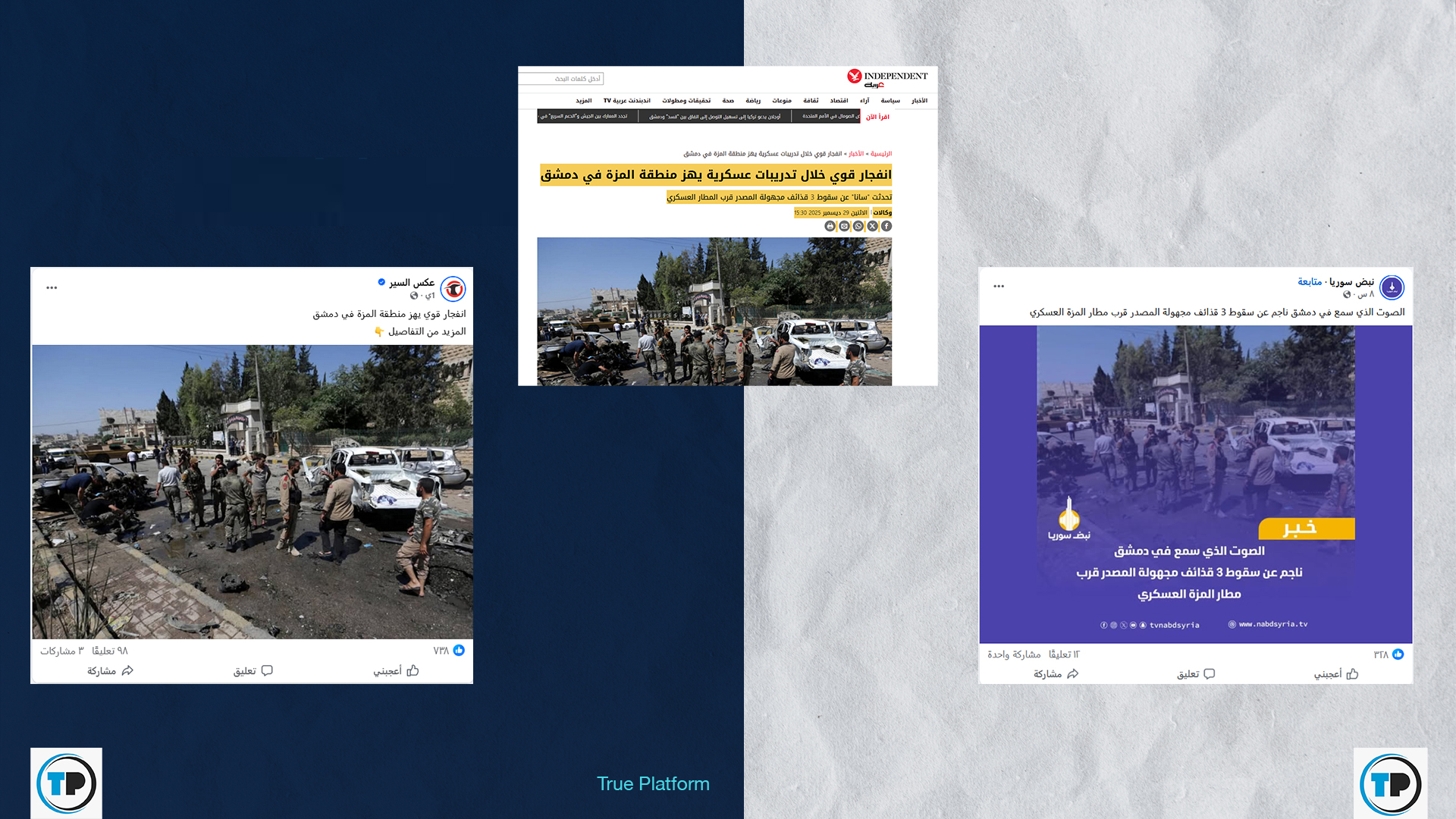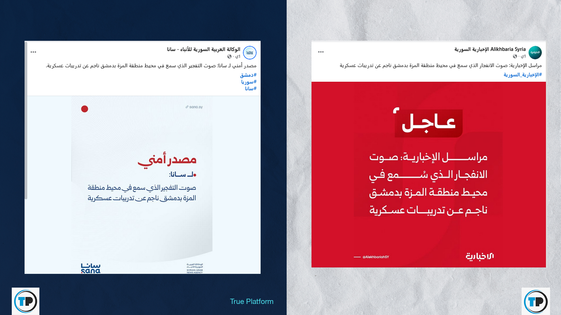 – أظهر البحث وجود تضاربت في الأنباء حول السبب الحقيقي لدوي الانفجار في حي المزة؛ حيث أفادت وسائل إعلام رسمية بأنه ناتج عن “تدريبات عسكرية”، بينما ذكرت وسائل إعلام عربية و مستقلة وحسابات معارضة أن الصوت نجم عن “سقوط 3 قذائف” في محيط مطار المزة العسكري. ولم يسجل أي مصدر موثوق وقوع هجوم انتحاري.