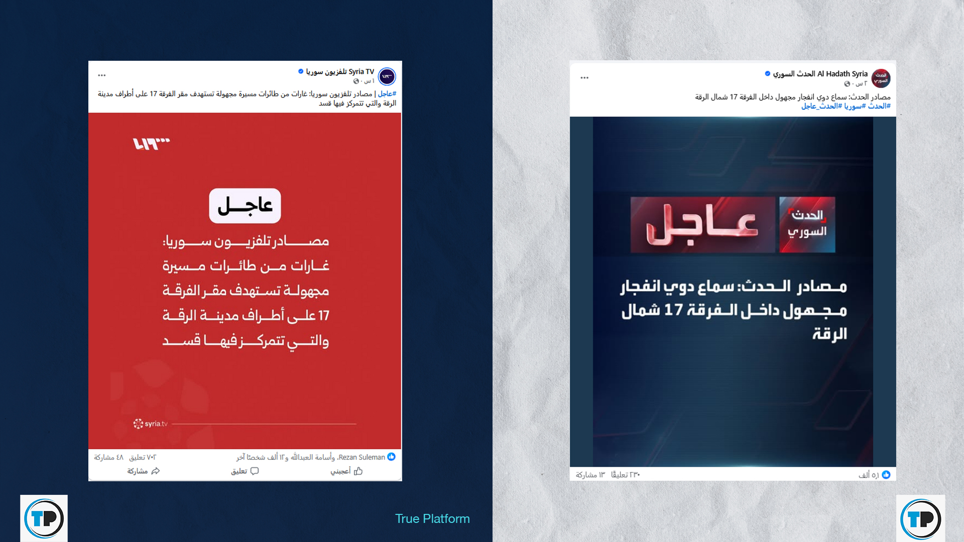 -الادعاء أن الفرقة 17 في محيط مدينة الرقة تعرضت لقصف مسيرات مجهولة، غير صحيح.