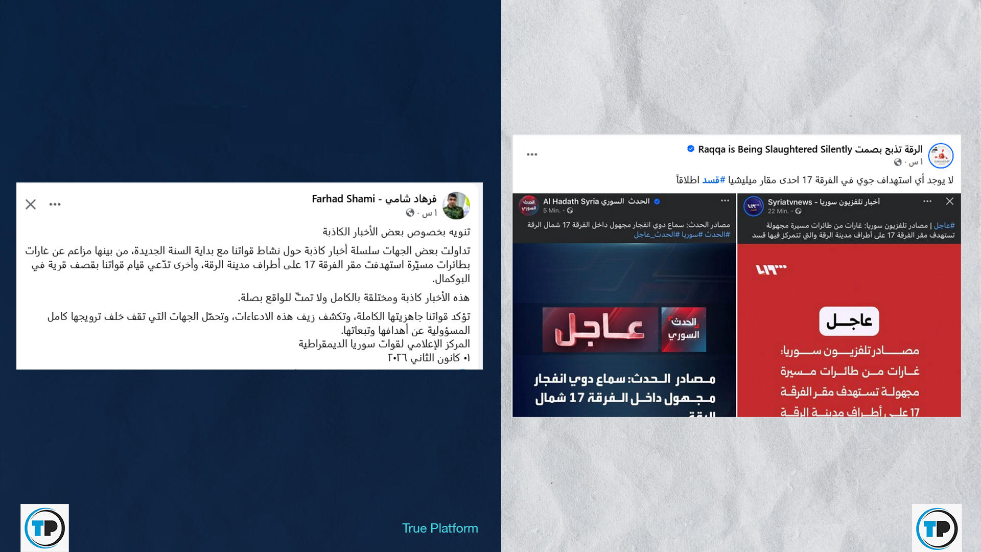 تحرى فريق شبكة تدقيق المعلومات-True Platform، حقيقة الادعاء، وأجرى بحثاً عبر المصادر المفتوحة شمل محرك البحث غوغل، ومنصة فيسبوك، كما راجع حسابات رسمية لقوات سوريا الديمقراطية، وتبين في الخلاصة أن الادعاء مفبرك.