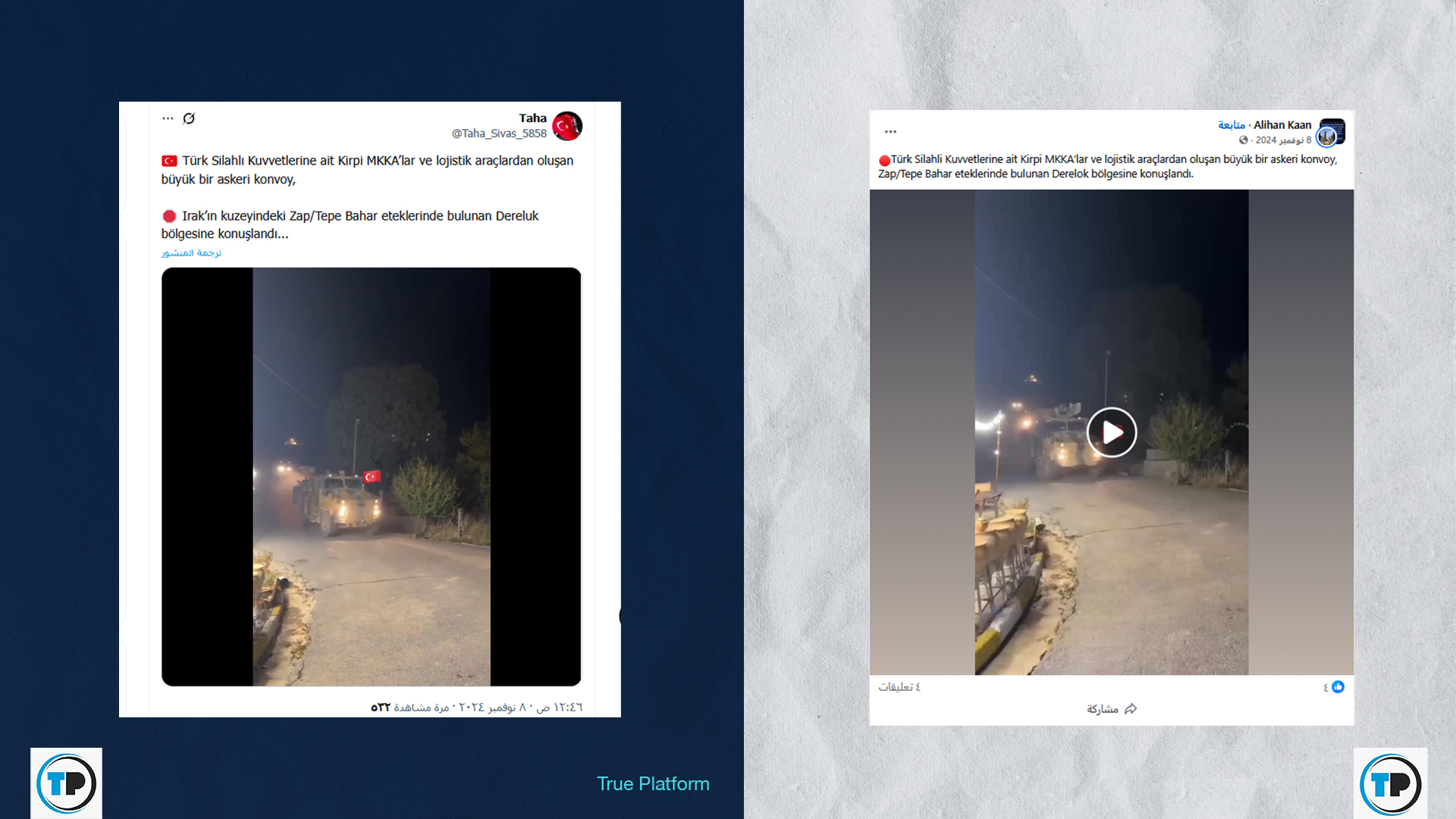 – أظهرت نتتائج البحث العكسي أن أقدم نشر للفيديو يعود إلى 8 تشرين الثاني/ نوفمبر 2024عبر حسابات تركية قالت إنه لـ”قافلة عسكرية كبيرة تتألف من مركبات كيربي المدرعة ومركبات لوجستية تابعة للقوات المسلحة التركية،تم نشرها في منطقة درلوك، الواقعة عند سفوح جبال زاب/تيبي بهار في شمال العراق”.