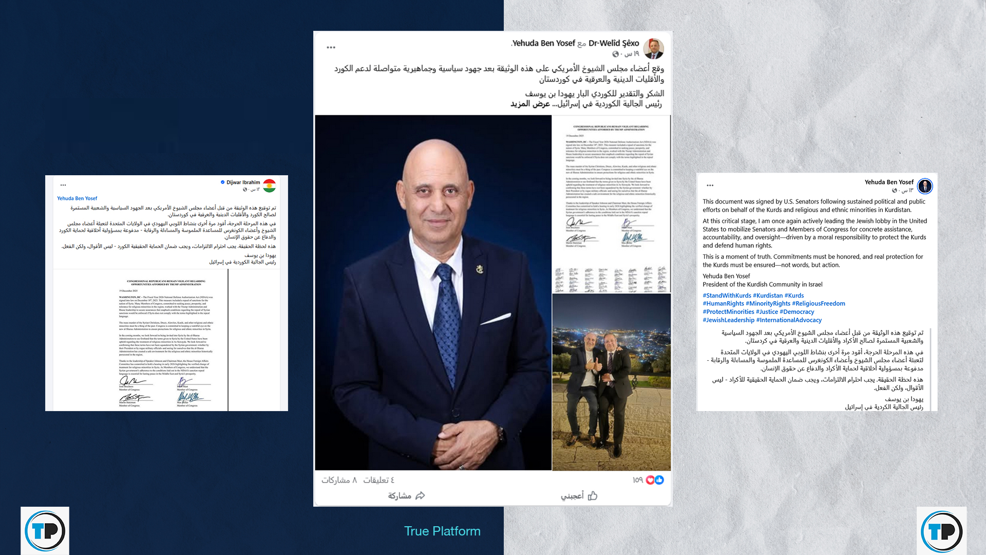 تداولت صفحات وحسابات عبر منصة فيسبوك، مؤخراً، صورة لبيانٍ مشترك لـ 134 عضواً من الكونغرس الأمريكي، يطالبون فيه الإدارة الأمريكية بفرض رقابة على الحكومة السورية لضمان حماية الأقليات في سوريا، مرفقة بمنشورٍ ينسب الفضل في صدور هذا البيان إلى من وصف برئيس الجالية الكردية في #إسرائيل “يهودا بن يوسف“.