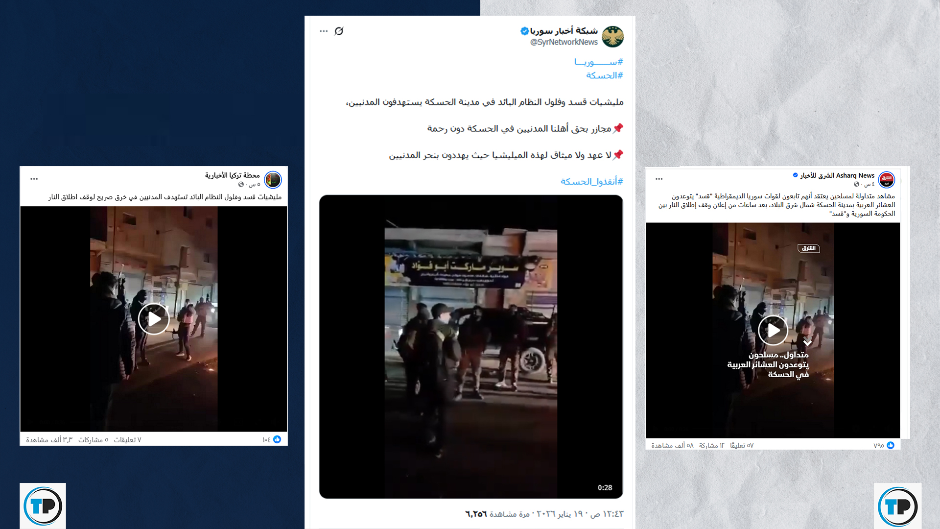 تداول صحفيون إلى جانب وسائل إعلام و صفحات وحسابات عبر منصتي فيسبوك وإكس، مؤخراً، مقطع فيديو مع ادعاءٍ بأنه يظهر مجموعة من قوات سوريا الديمقراطية (قسد) مع “فلول النظام” في مدينة الحسكة، وهم يستهدفون المدنيين ويرتكبون المجازر.