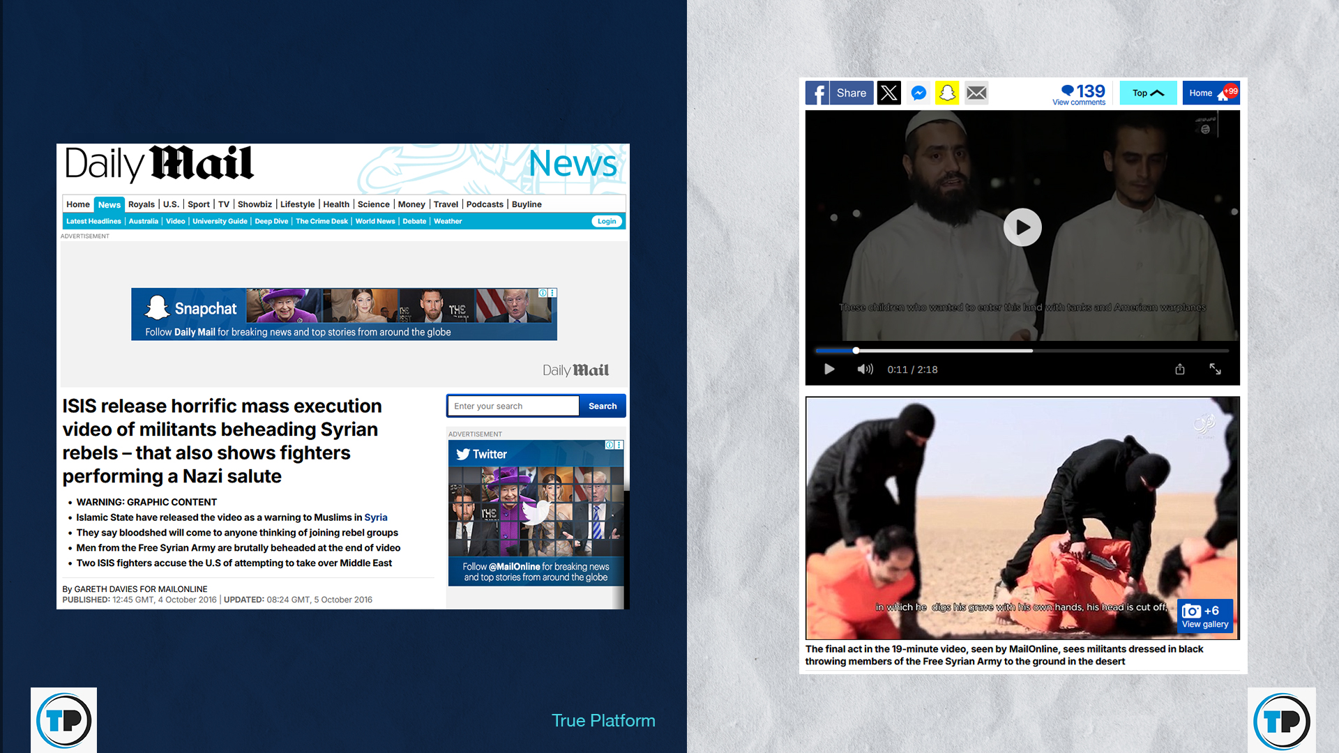 -يصف تقرير الديلي ميل ذات الشخص الذي يظهر رفقة شخص آخر في إصدار داعش، على أنهما “جهاديان يلقيان خطاباً يتهمان فيه الولايات المتحدة بمحاولة السيطرة على الشرق الأوسط. في المشهد قبل الأخير من الفيديو الذي تبلغ مدته 19 دقيقة، وذلك قبل قتل أعضاء من “الجيش السوري الحر” بوحشية.