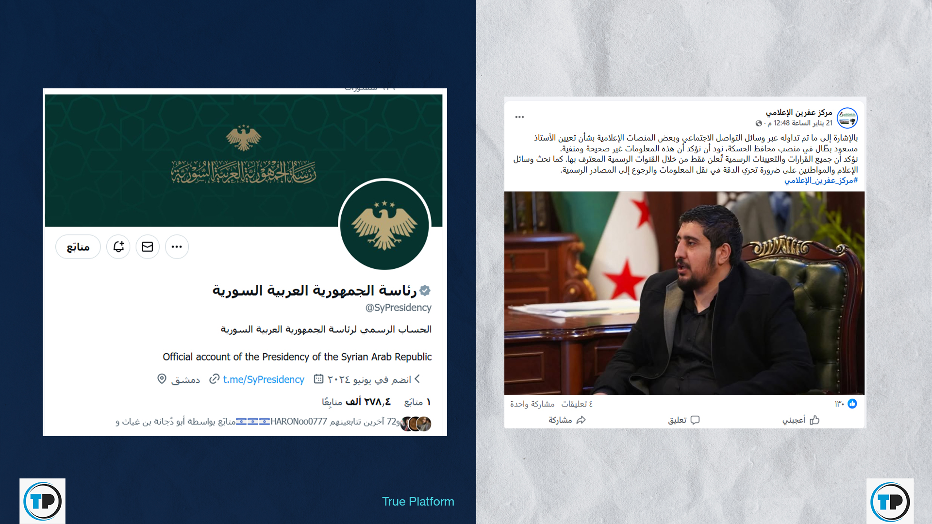 تحرى فريق شبكة تدقيق المعلومات – True Platform، حقيقة الادعاء، فأجرى بحثاً عبر المصادر المفتوحة شمل محرك البحث غوغل وراجع حسابات رئاسة الجمهورية والحكومة السورية ووسائل إعلام رسمية ومحلية، وتبين أن الادعاء ملفق.