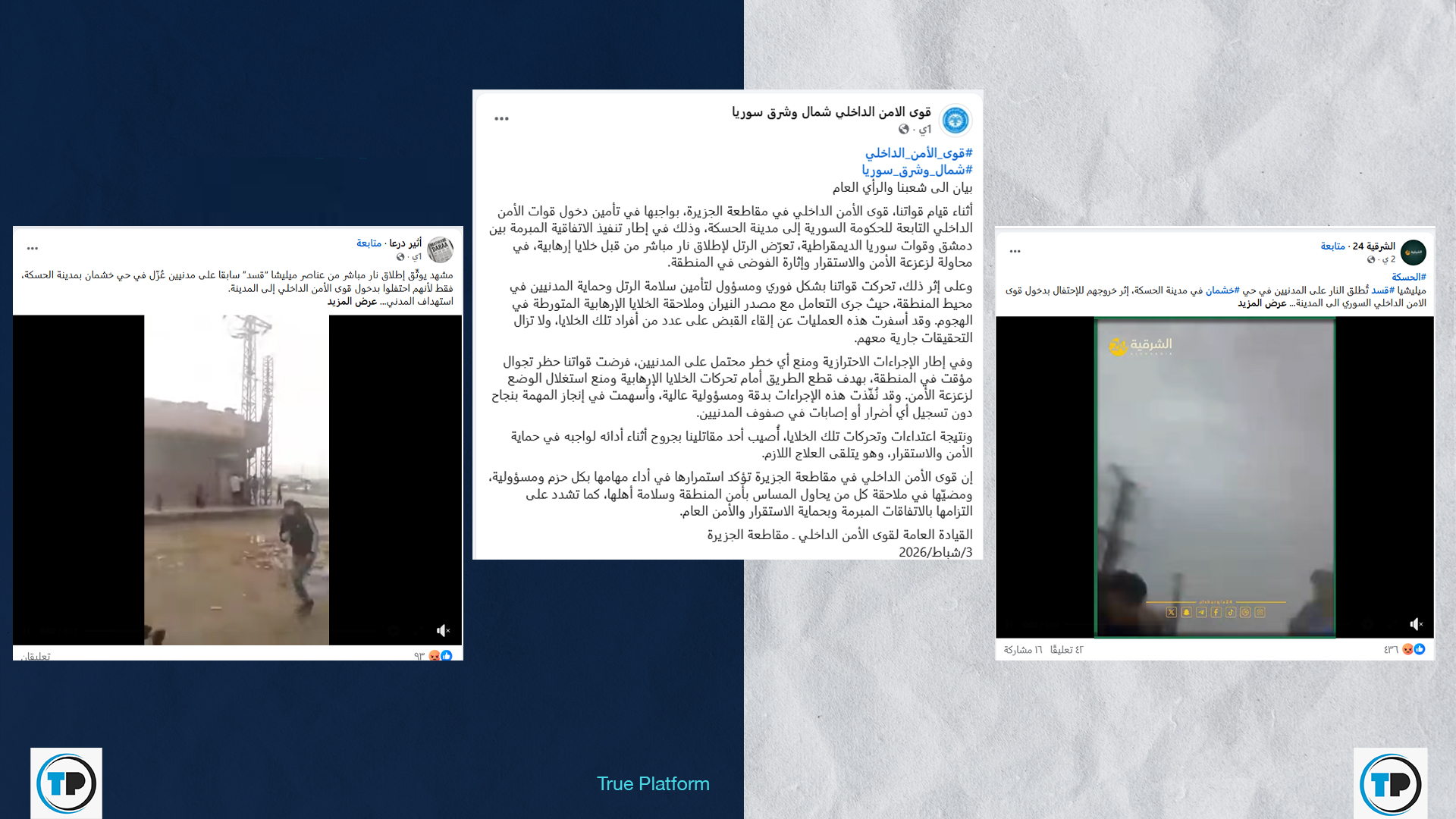 -تداولت حسابات وصفحات محلية، مقاطع فيديو على أنها توثق حدوث إطلاق نار على المدنيين ضمن أحياء مدينة الحسكة بعد خروجهم للاحتفال بدخول قوى الأمن السورية، بينما زعمت قوى الأسايش التابعة للإدارة الذاتية تعرضها لإطلاق نار، لذا لا تنفي هذه المادة كلا الادعائين، ولم يتسن لفريقنا التحقق من صحتهما، كما لا تنفي وقوع انتهاكات بحق المدنيين.