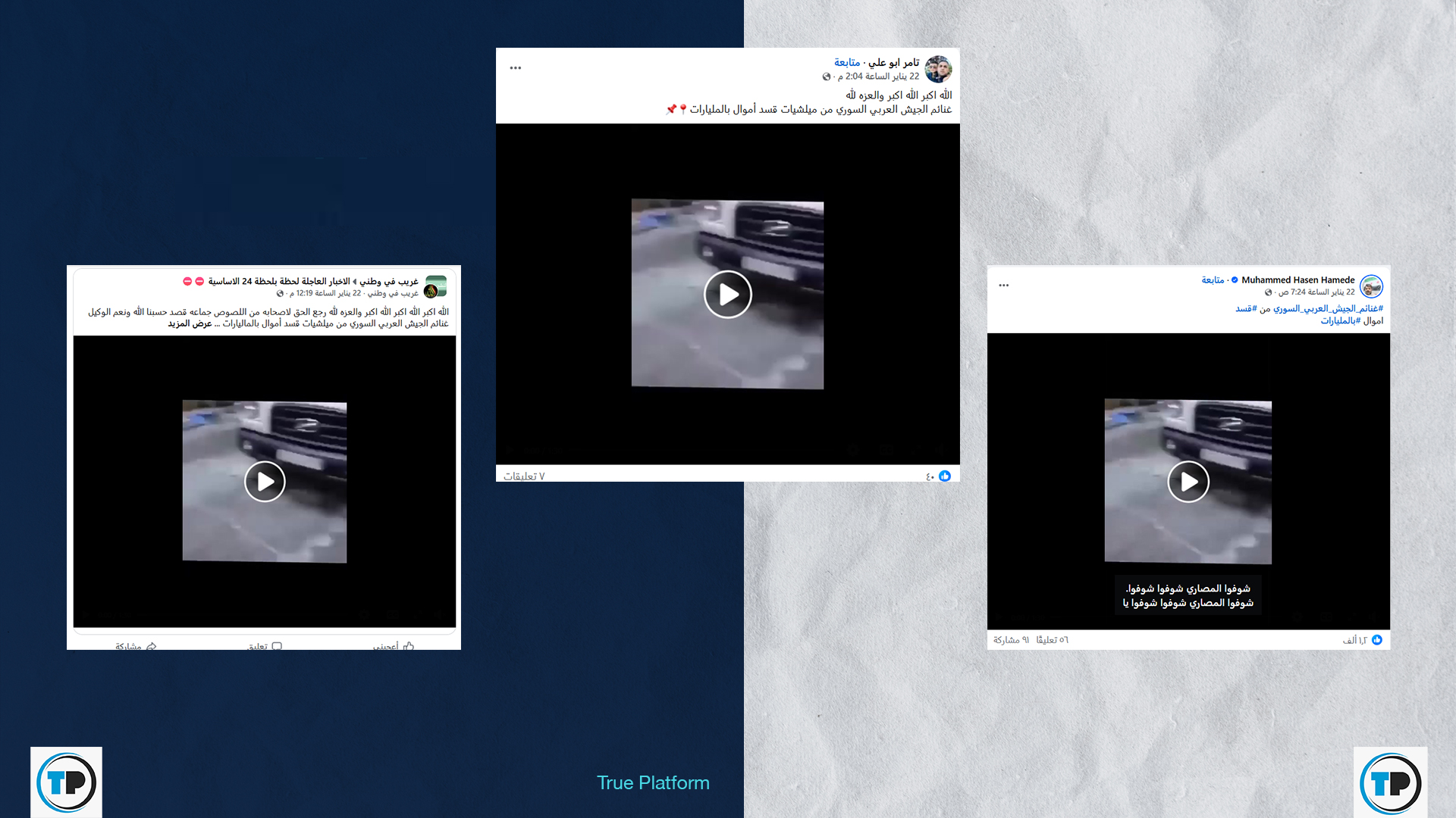تداولت صفحات وحسابات عبر منصة “فيسبوك”، مؤخراً، مقطع فيديو مرفقاً بادعاء يزعم أنه يوثق استيلاء الجيش السوري على كميات ضخمة من الأموال كغنائم من قوات سوريا الديمقراطية (قسد)، دون ذكر تفاصيل إضافية.
