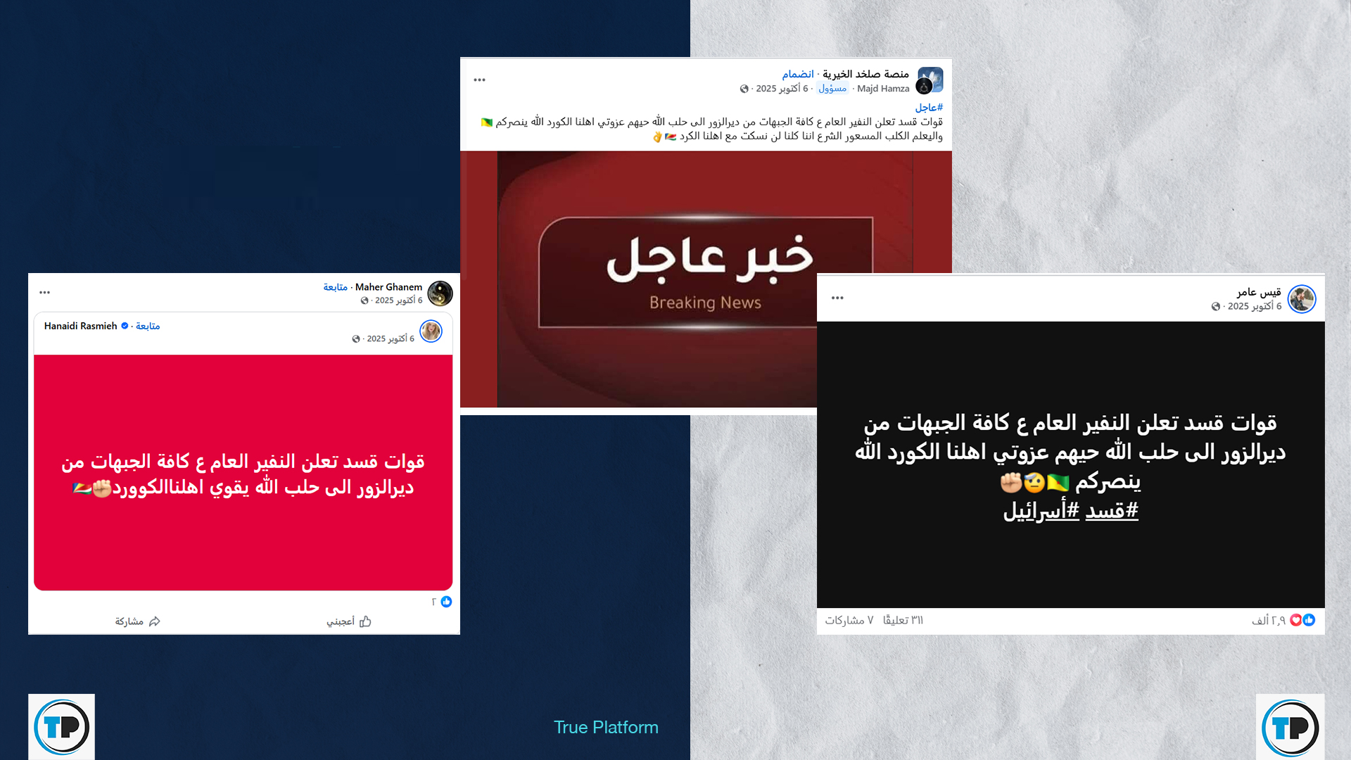 تداولت حسابات وصفحات عبر منصة فيسبوك، مؤخراً، ادعاءً مفاده أن قوات سوريا الديمقراطية(قسد) أعلنت “النفير العام” على كافة الجبهات الممتدة من دير الزور إلى حلب.