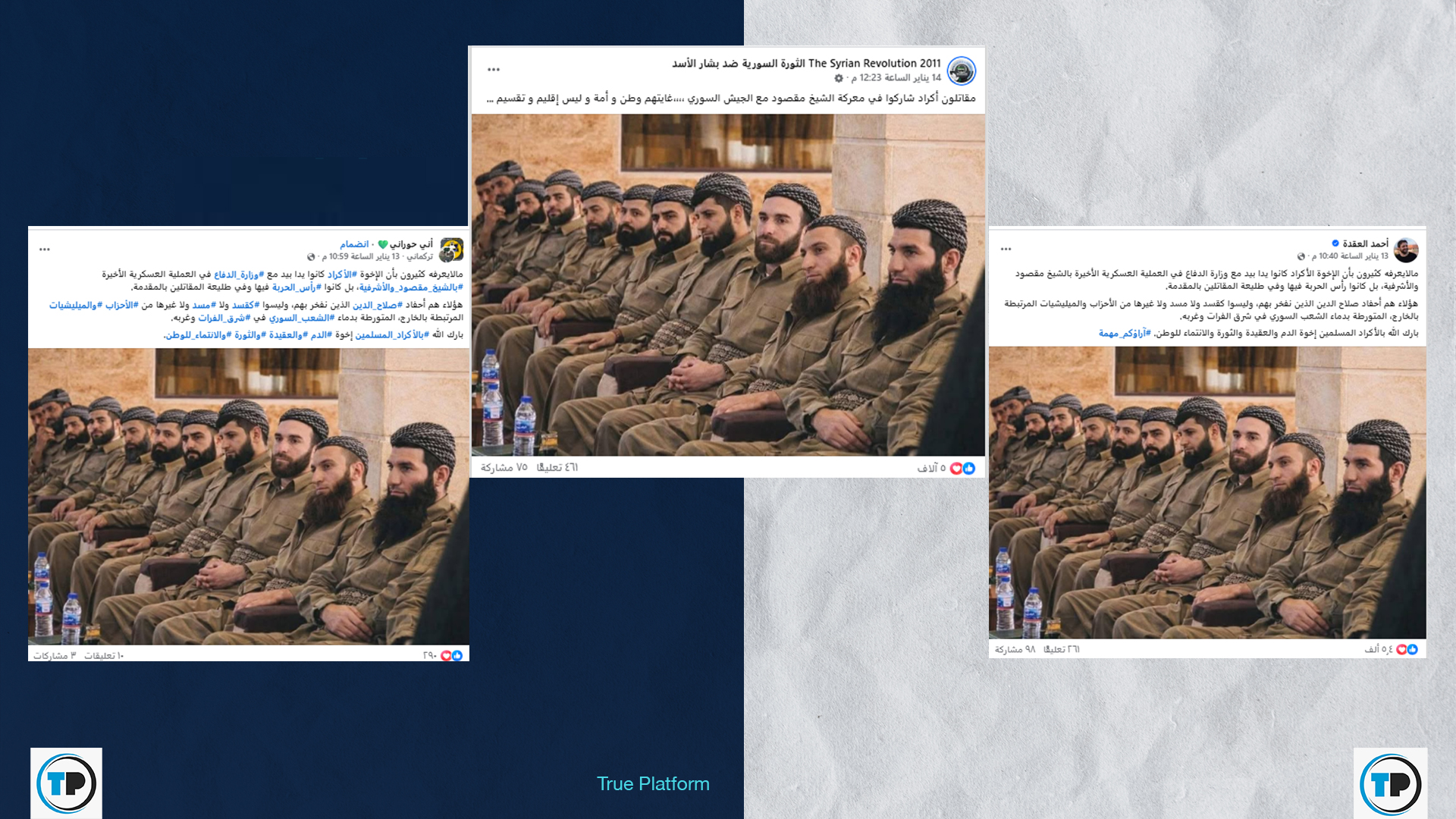 -لا تنفي المادة احتمالية وجود أكراد من خارج سوريا وداخلها ضمن الجيش السوري خاصة وأن هيئة تحرير الشام كانت متحالفة مع جماعات كردية سلفية من إيران وتركيا وسوريا، لكن هذه الصورة تحديداً مضللة.