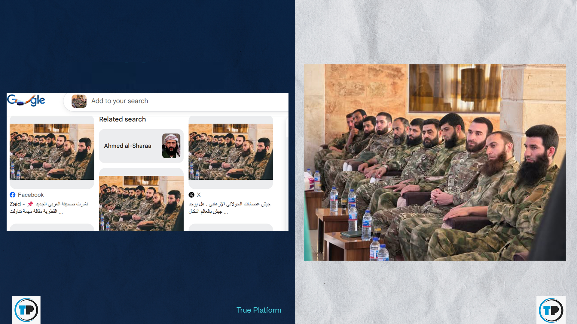 -أظهر البحث العكسي أن الصورة المتداولة معدلة عن صورة أصلية كانت قد نشرتها حسابات وزارة الدفاع السورية في تشرين الأول/أكتوبر 2025، وتعود في الأصل لاجتماع رئيس هيئة الأركان مع قيادات عسكرية وأمنية في محافظة طرطوس.