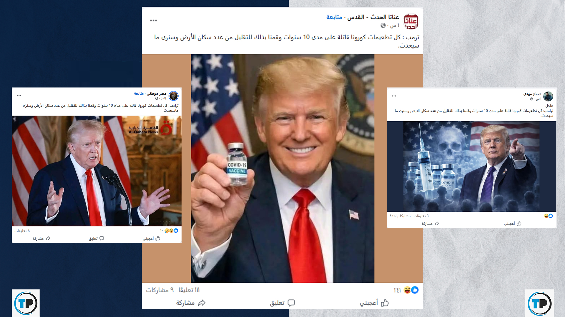 تداولت صفحات وحسابات على منصات التواصل الاجتماعي، تصريحاً منسوباً للرئيس الأمريكي دونالد ترامب، يزعم فيه أن “كل تطعيمات كورونا قاتلة على مدى 10 سنوات”، وأن الهدف منها كان “التقليل من عدد سكان الأرض”، مختتماً تصريحه بعبارة “سنرى ما سيحدث”.